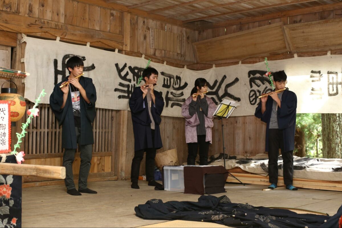 内訳は中高生を含む地元の方々、学生団体のメンバー、同じ長野県内で神楽の復活経験がある協力者などさまざま。楽譜が完成した8月終わりから、毎週金曜日に集まって練習を重ねました。篠笛を初めて吹く人から、普段太鼓クラブで精力的に活躍している人まで、経験値に差こそあれ、皆が同じスタートラインから始まりました。約1ヶ月という短い期間でしたが、自主練習も含めて各々が復活を志して力を尽くしました。