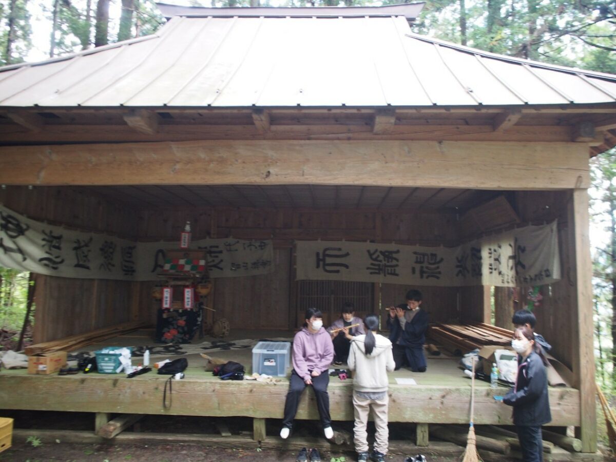 時間にゆとりができたため、篠笛のメンバー数人による自主練習が行われました。私も吹いてみましたが、これまで集会所の狭い空間で大きく響いていた笛の音は、開放的な神楽殿の上では風にのって立ち消えてしまうような感がありました。屋内と屋外ではこれほど違うものかと唖然としました。
