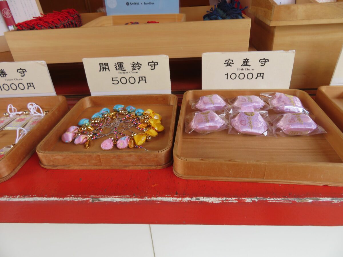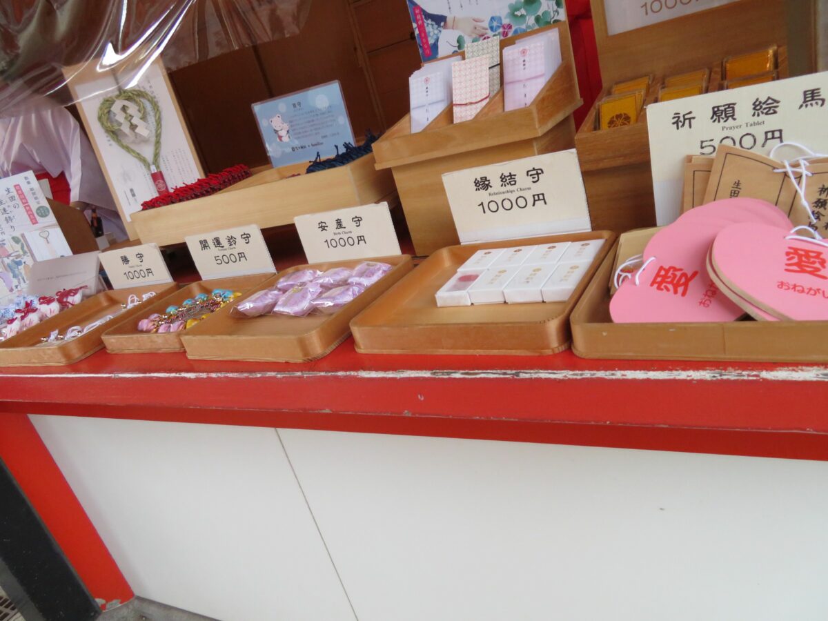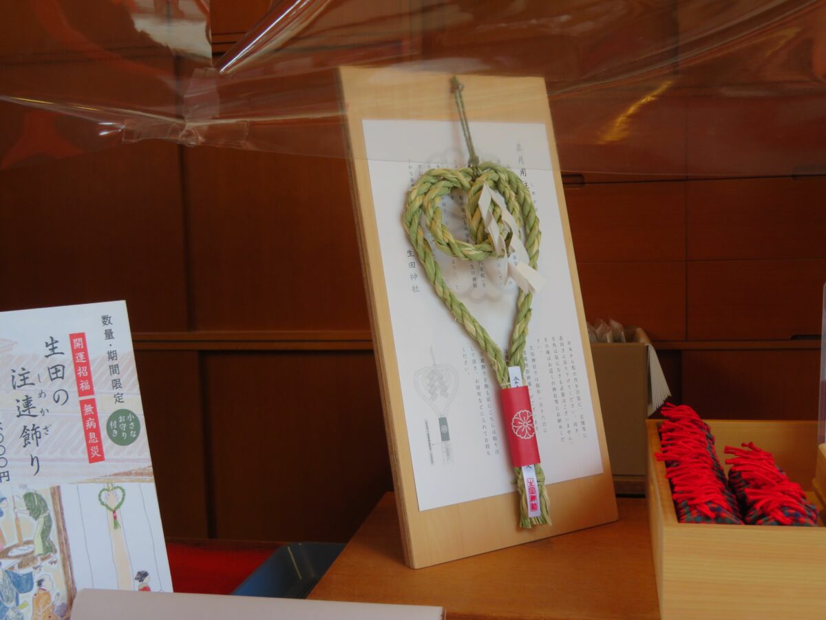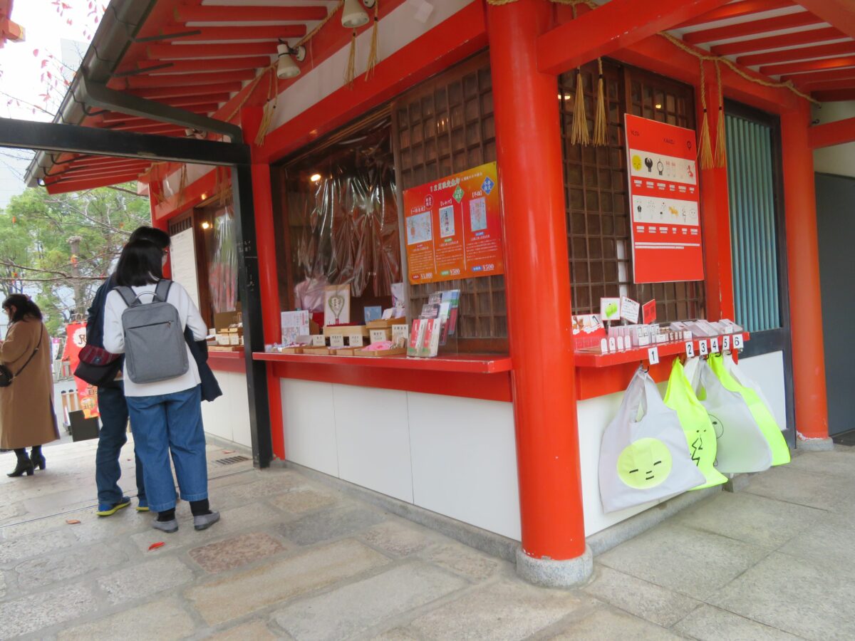 生田神社では御朱印所と授与所は異なる場所に設けられ、授与品が並ぶのは正面玄関の楼門の西です。門の柱の間には、様々な授与品がずらりと並びます。縁結守やハート形の絵馬をはじめ、神社オリジナルの注連飾り、あぶらとり紙、消しゴム、エコバッグまで揃っています。