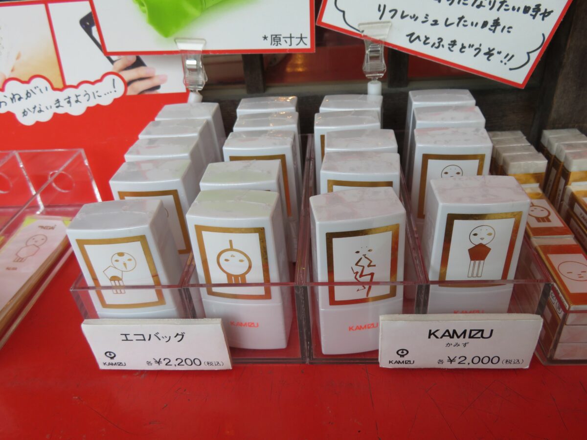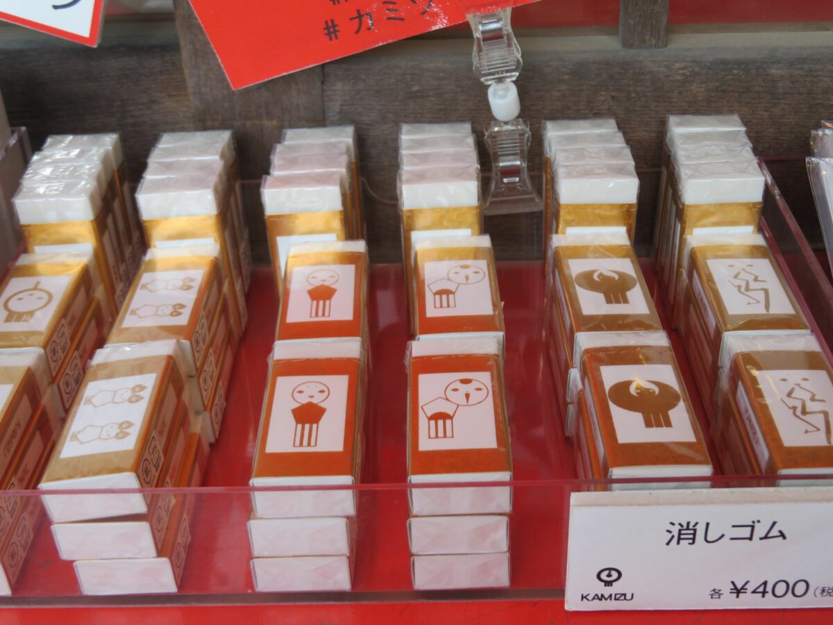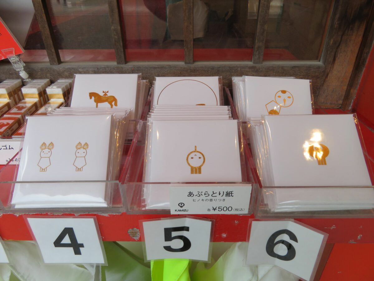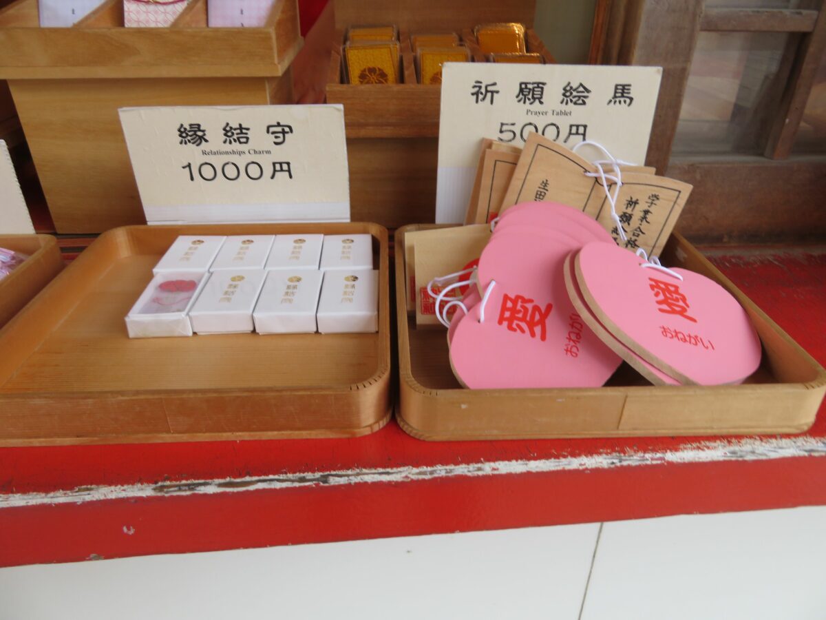 生田神社では御朱印所と授与所は異なる場所に設けられ、授与品が並ぶのは正面玄関の楼門の西です。門の柱の間には、様々な授与品がずらりと並びます。縁結守やハート形の絵馬をはじめ、神社オリジナルの注連飾り、あぶらとり紙、消しゴム、エコバッグまで揃っています。
