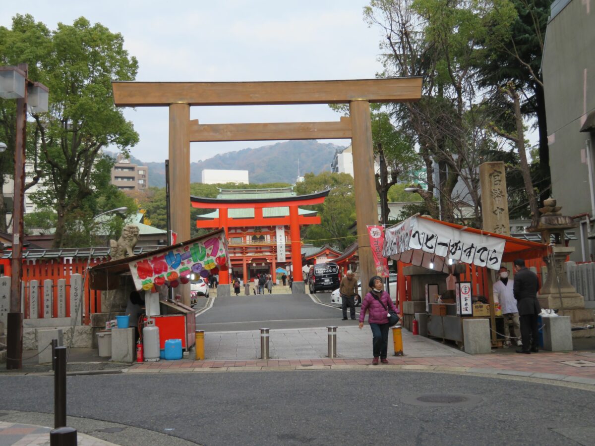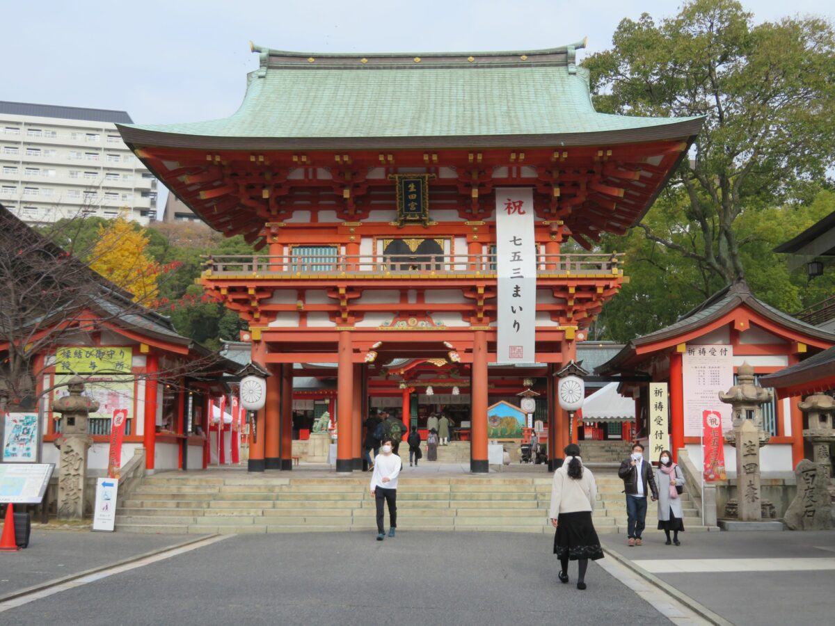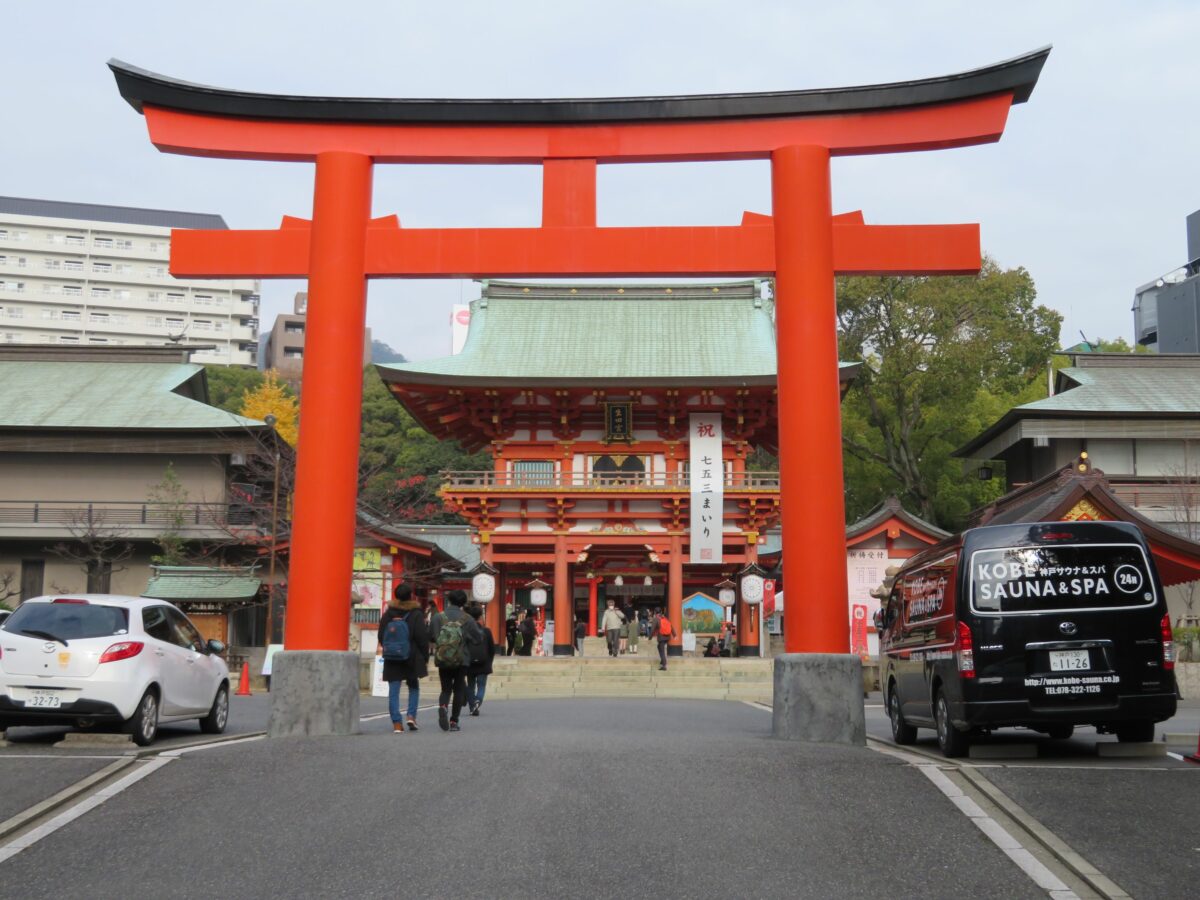 生田神社の創建については『日本書紀』の中に記述があるようです。201年に神功皇后が三韓外征からの凱旋の途中、神戸港の沖合で船が進まなくなったときに神託を受け、稚日女尊を祀ったことが起源とされています。縁むすびのご利益があるとされ、2007年には女優の藤原紀香さんとお笑いタレントの陣内智則さんの結婚式が行われました。境内の南に建つ2つの鳥居と楼門が訪れた人々を出迎えてくれます。