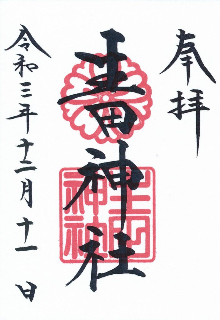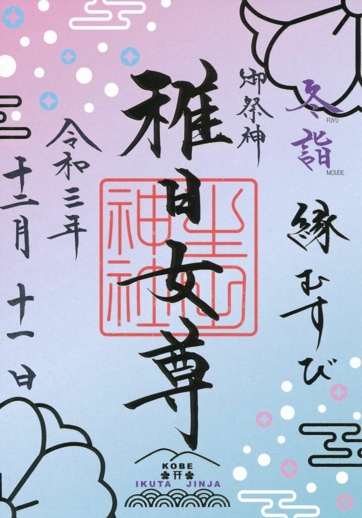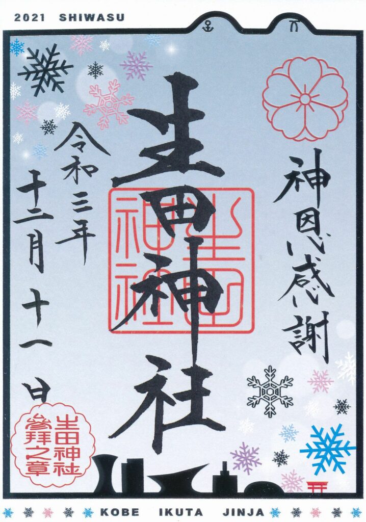 2021年の12月限定御朱印は、用紙の上下に神戸のランドマークや風景がかたどられ、澄んだ空気に舞う雪がデザインされています。冬季限定の御朱印には、神社の御祭神の縁むすびの神様「稚日女尊(わかひるめのみこと)」の文字が記されます。