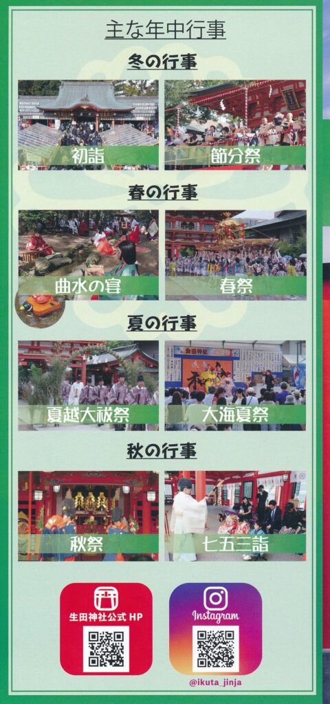 また、4月の「生田祭神幸式」では楼門から、三宮のショッピングエリアを南北に繋がるイクタロードを神幸行列が繰り出します。猿田彦神が先導する行列からは、御先太鼓の雄壮かつ軽快なサウンドが響き渡ります。
