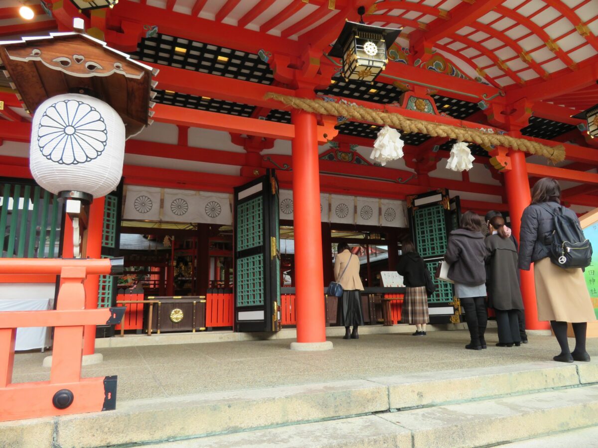 神社の中心施設である拝殿は、1995年1月17日には阪神・淡路大震災によって倒壊してしまいました。優雅な曲線をもつ屋根は地面に崩れ落ちましたが、約1年半後に震災前と同じ外観で復元されました。朱塗りの柱の中央の唐破風の屋根が極めて印象的です。