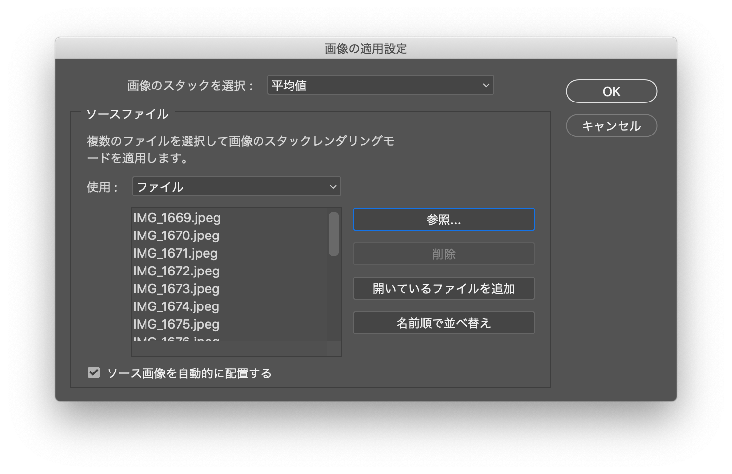 2.Photoshopを立ち上げ,メニューバーより[ファイル]-[スクリプト]-[統計]の順に掘り下げていきます。「画像の適用設定」画面にて,「画像のスタックを選択」から「平均値」を選択します。「参照」ボタンを押下して「1.」で撮影した写真を取り込みます。「ソース画像を自動的に配置する」のチェックを忘れずに!
