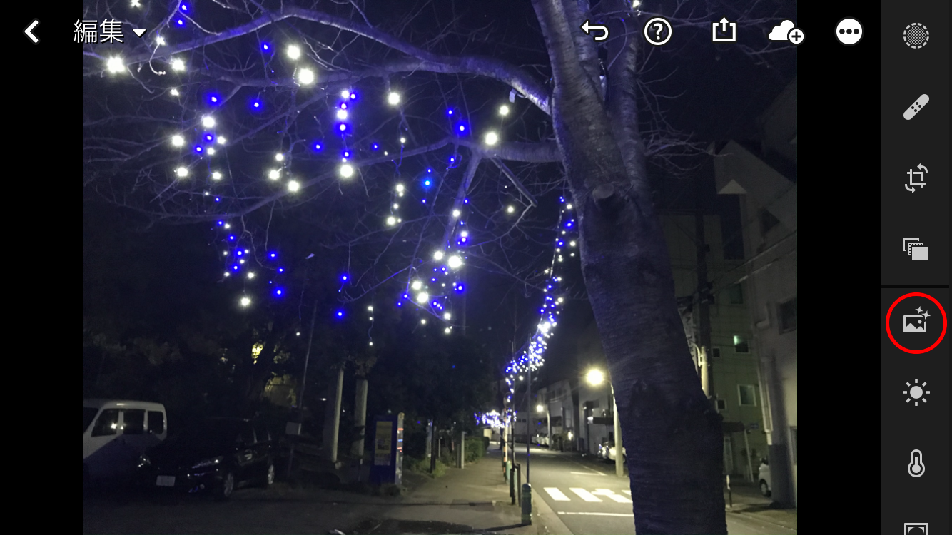 編集したい写真をタップすると,選択した写真が拡大されます。最初に赤丸で囲ったアイコンをタップして自働調整します。