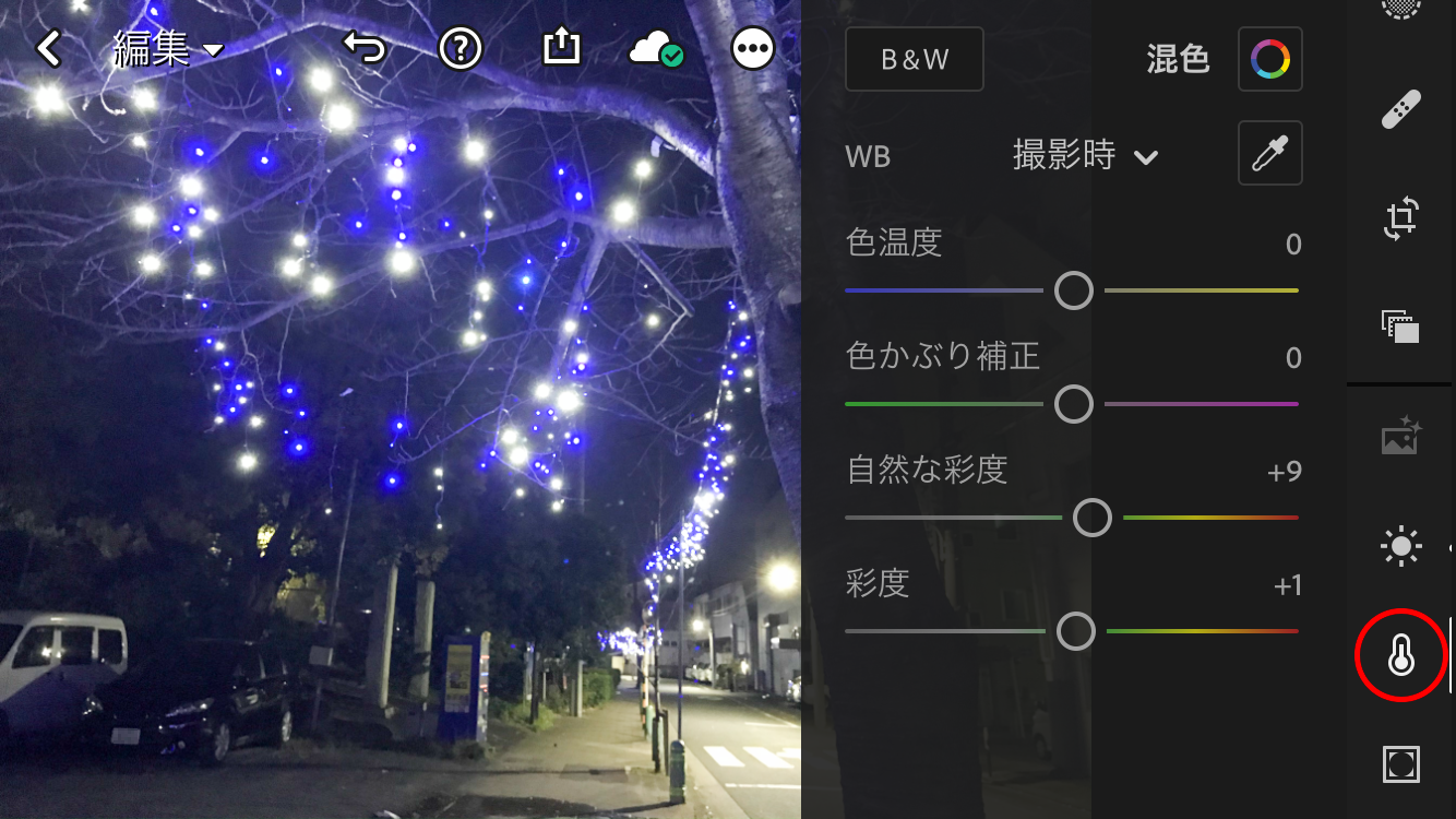 ライトの微調整が済んだら温度計のアイコンをタップしてカラーの調整を行います。色のバランスが悪いと感じる場合はここで調整します。各スライダーで試行錯誤するのもいいですが,ホワイトバランス選択ツール(スポイトツール)を使用すると簡単に色調を補正できます。スポイトのアイコンをタップすると選択ツールが出てきます。選択ツールをニュートラルなグレーに指定したい領域に移動すると,その場所を基準に画面全体の色が調整されます。