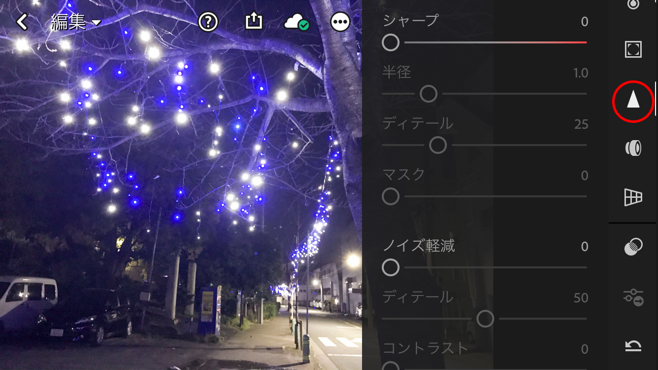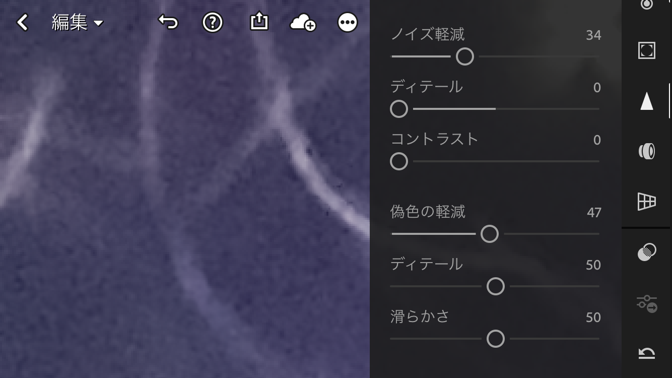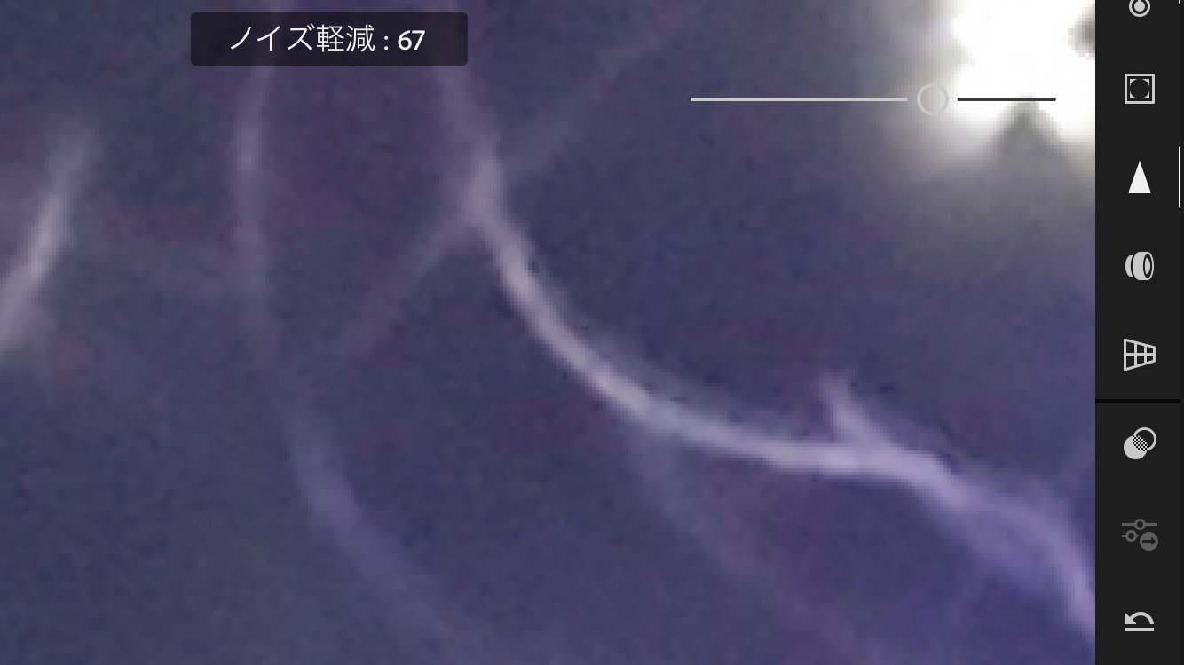 三角形のアイコン(ディテールの調整)をタップすると,ノイズの軽減を行うことができす。「ノイズ軽減スライダー」を左右に動かしながら,目障りなノイズを軽減していきます。