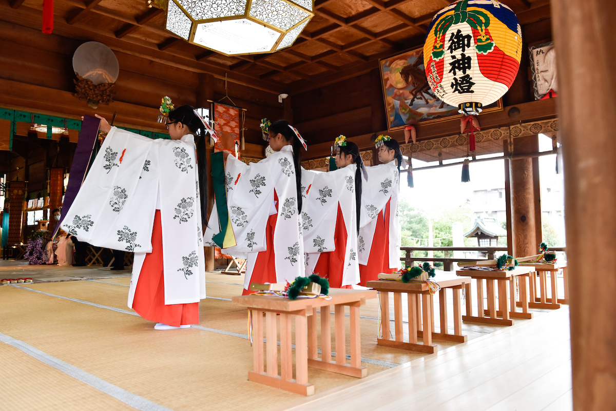 今回、お祭りの当日は、毎年行われる浦安の舞に加えて、日本舞踊、創作舞踊なども実施された。また、餅まきなども行われ、いつも以上に出し物が多い秋季例祭となったようだ。
