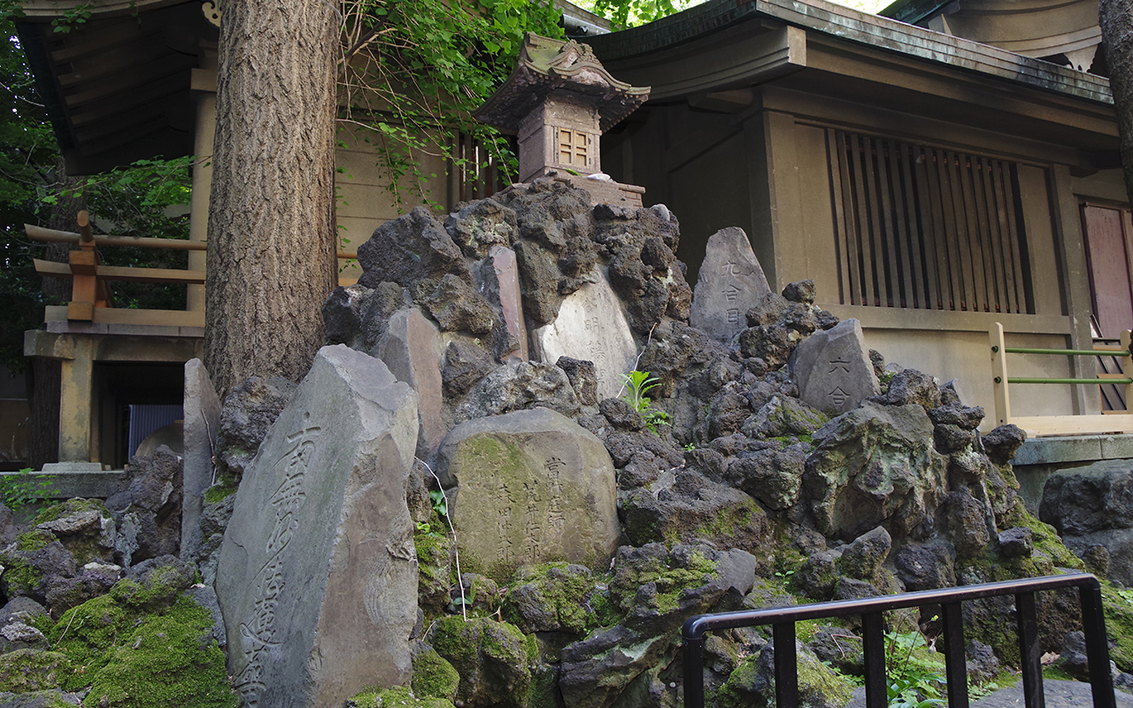 敷地内には、もう一社、“浅間神社”が存在。浅間神社はもともと明治期以前までは境内に祀られていた別の神社でしたが、明治27年に、稲荷鬼王神社に合祀。その後、庭師や植木氏の方たちが好んで道中安全のお参りをした西大久保の厄除け富士として、境内で再建されました。その造りは、庭師・植木師の方たちの協力もあり、富士の岩だけでなく全国から岩がとりよせられ、現在の社務所よりも高い富士山が建立されていた、といわれています。