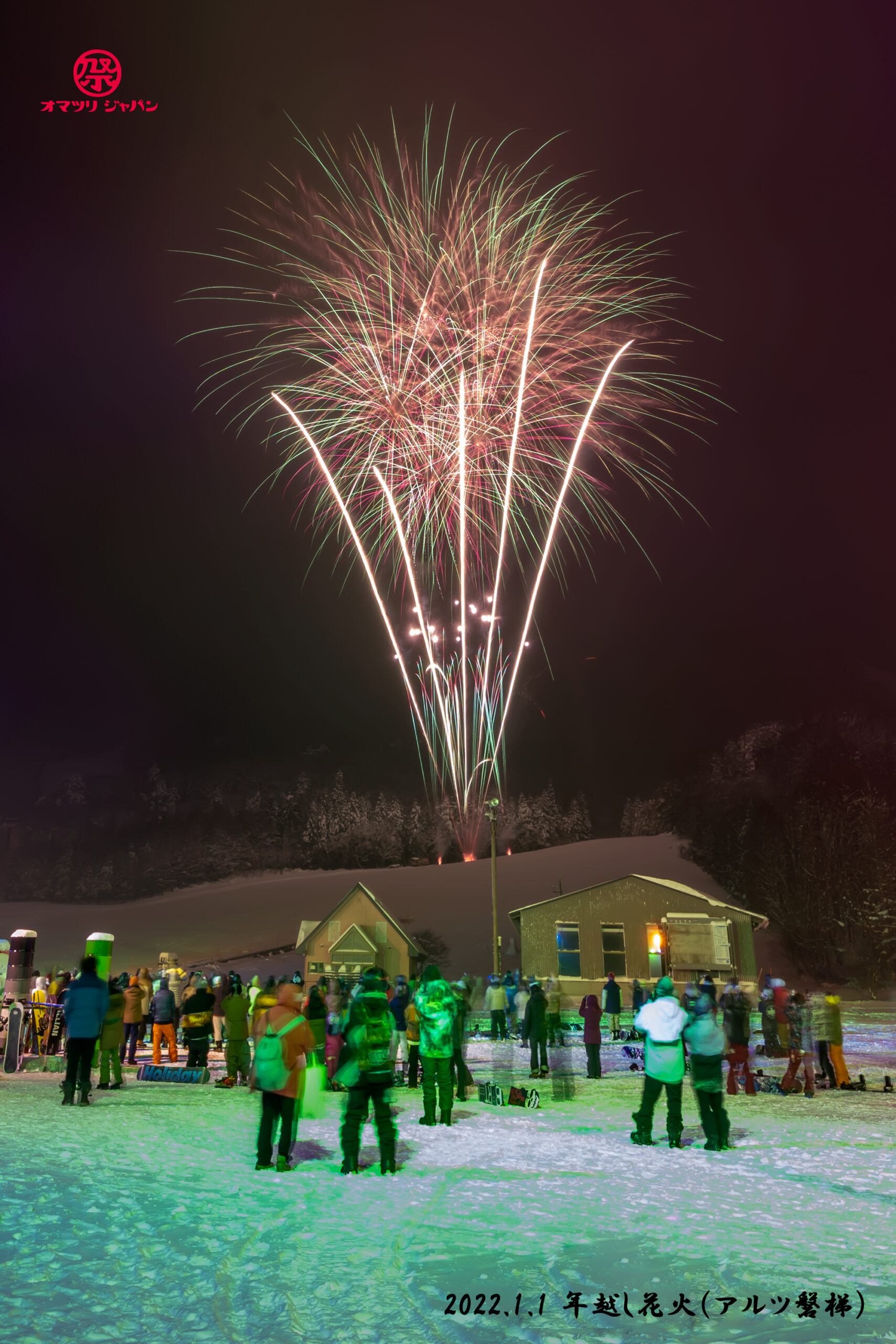 2022年へのカウントダウンを会場にいる全員で数え、ゼロの叫び声と同時に花火が打ち上がりました。約2~3分ほどの花火で最大号数は4号玉(開花直径120m)。マイナス7度の極寒の中で震えながら撮影に挑みましたが、途中から吹雪になってしまい、後半はほとんどカメラには何も映らない状態に…。それでも会場は大盛り上がりで素晴らしい新年の幕開けとなりました。