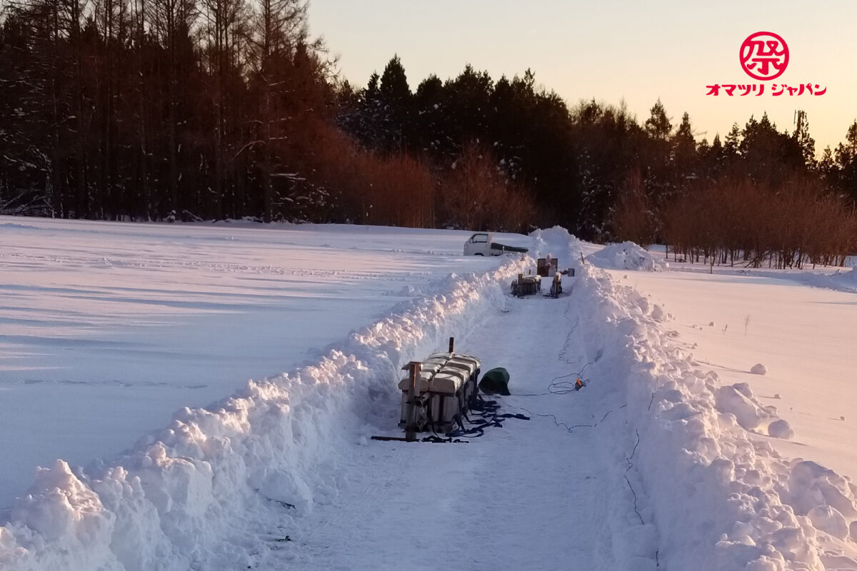 いなわしろ雪花火の打ち上げ開始は18:00からになるので、ウィンタースポーツを楽しんでいる人達を横目に三脚を担いでコースを上って打ち上げ近くの場所まで移動して待機。最大号数は5号玉(開花直径約150m)となり、20~30分間の打ち上げになります。