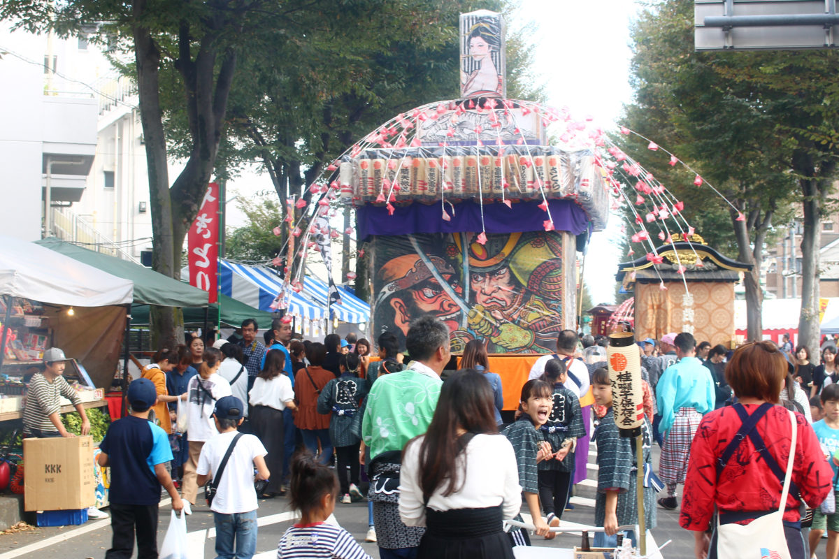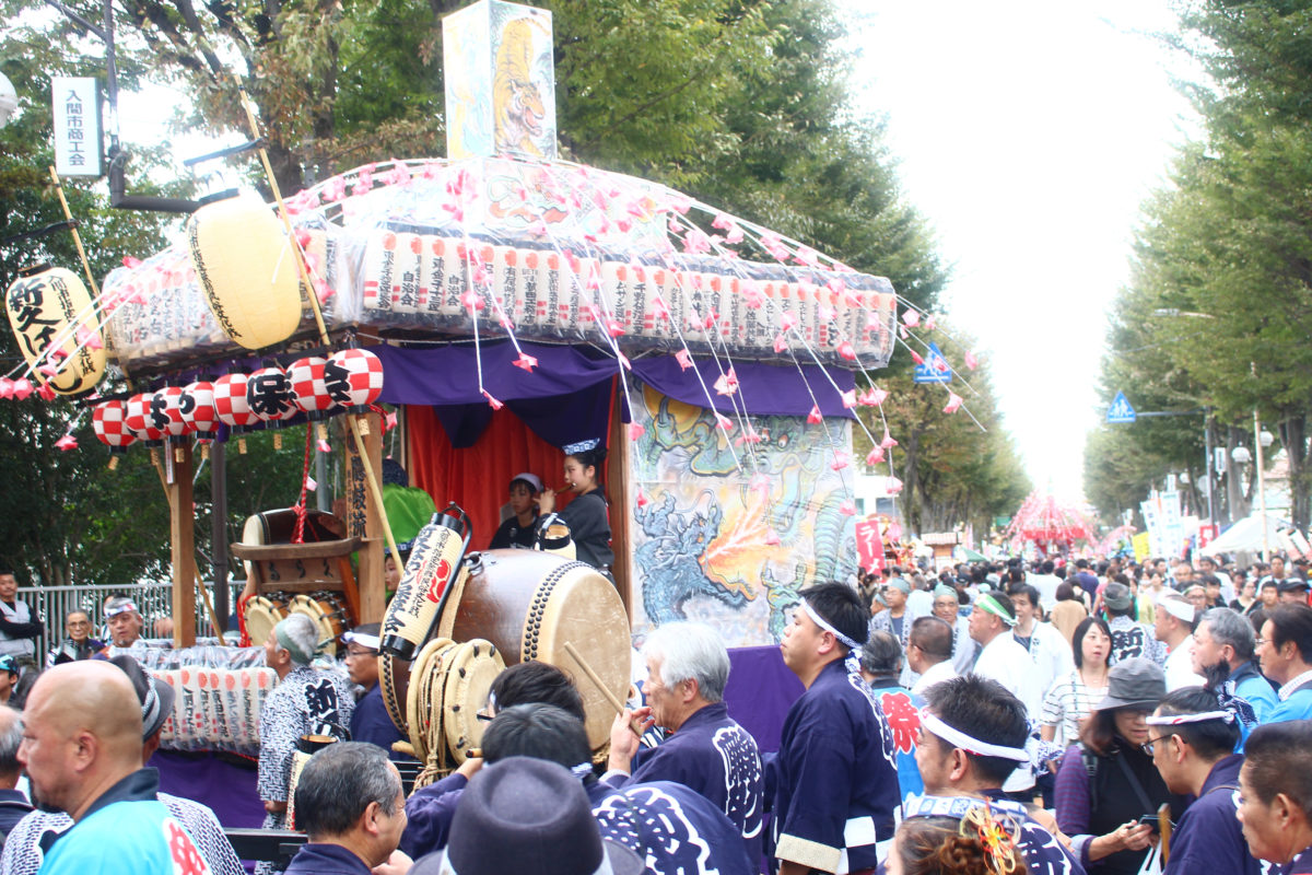 入間市駅を出てお祭り会場へ向かうと、お囃子や太鼓の音が大きくなってきます。さらに進むと山車が登場していました!