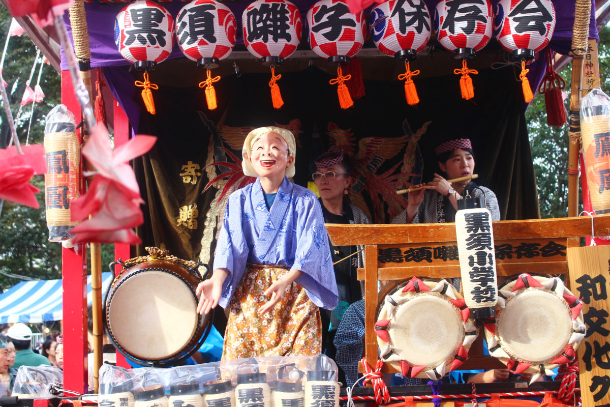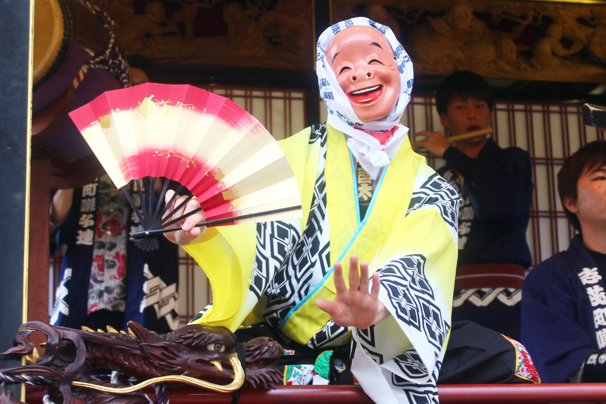 たくさんの山車・屋台がお祭りへ出ています。こちらは屋台で演武を行う翁です!