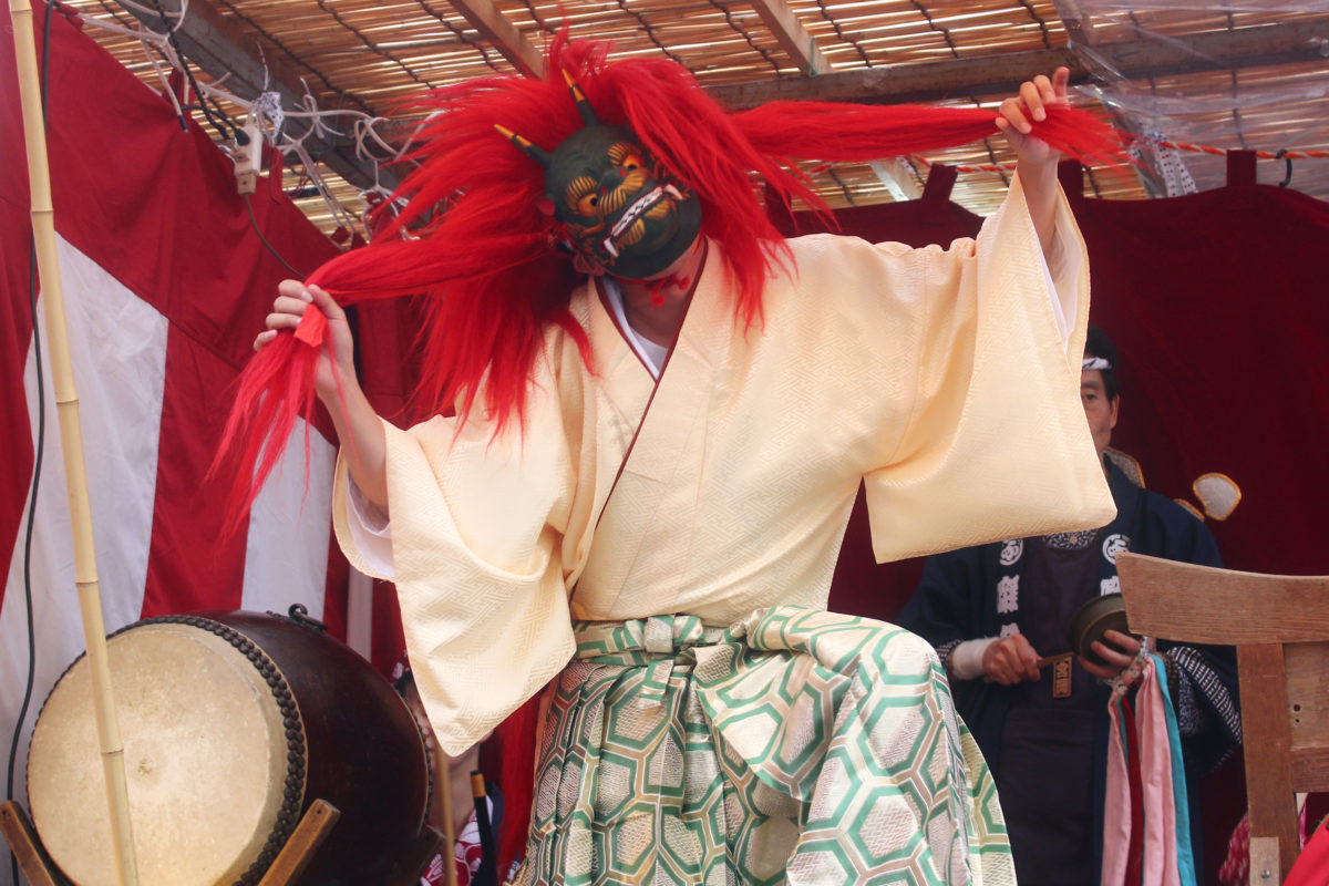 荒々しい赤鬼がパフォーマンスをしています。手を見ると持っているのはバチ。佐渡名物の鬼太鼓が行われていました!