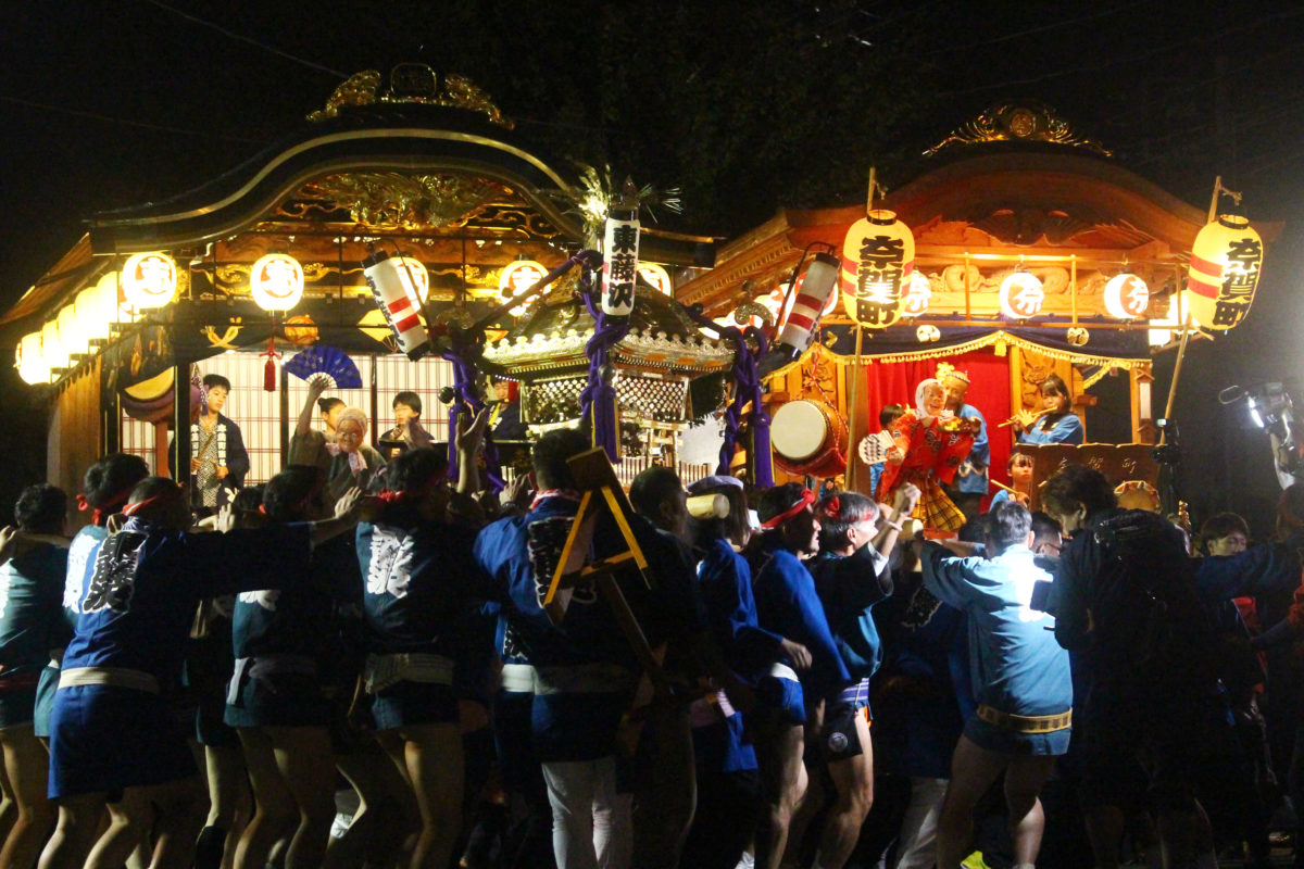 お神輿の渡御が終わり山車・屋台が揃った18時15分、本日最大の見せ場「ひっかわせ」が行われます!ひっかわせとは、山車・屋台が互いに競い合うようにお囃子や踊りを見せ合うもので見ごたえがあります!