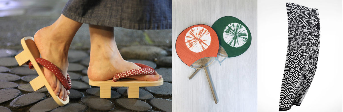 『盆ガジェットコレクション‼︎』で展開予定の商品の一部。左から、郡上木履(もくり)のおどり下駄、伊場仙のうちわ 、ヒロコレッジの手ぬぐい