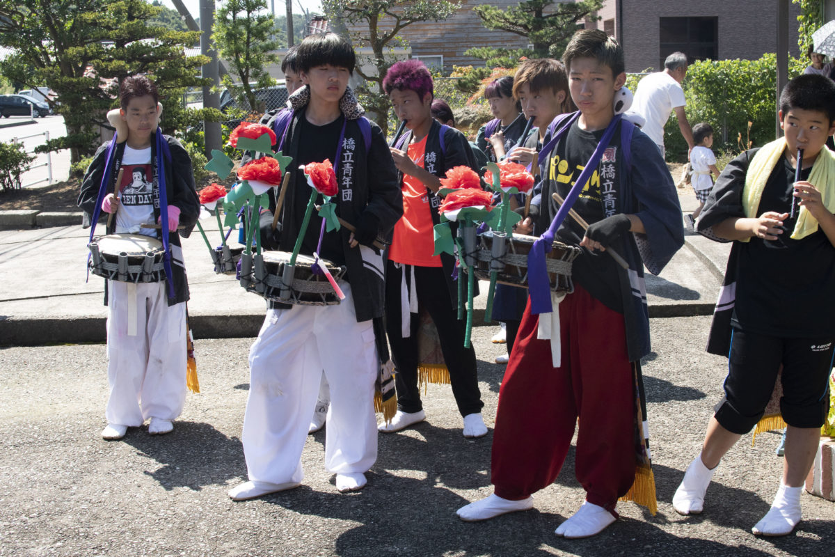 さて、こちらは橋立町の太鼓です。かなり小型で、子供達が獅子舞に合わせて叩きます。太鼓に花がくっつけてあるというのは、非常に興味深いです。