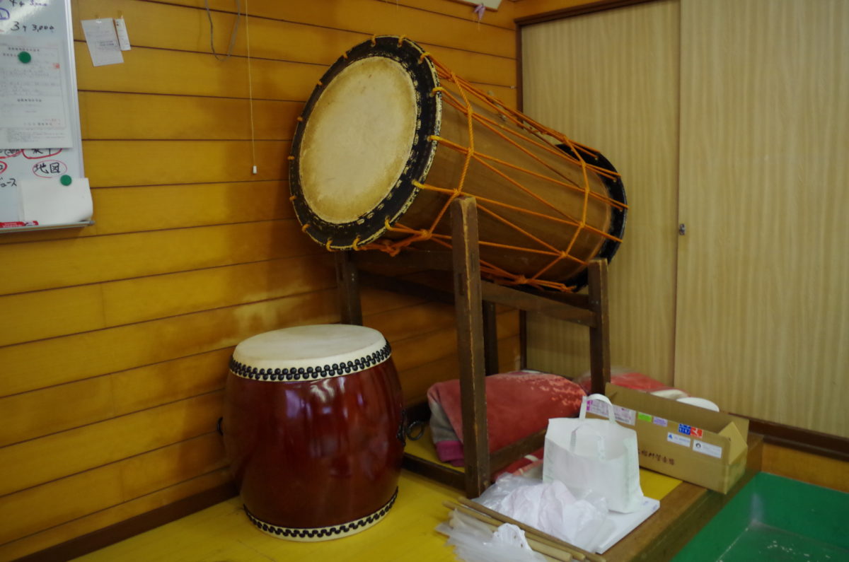 太鼓は大きいものだと大変です。移動する際の持ち運びはかなり体力が入りますし、顔の高さくらいデカいものを必死で叩くということもあるのです。上記写真は潮津町というところの太鼓で、大きなタイプと小さなタイプがあります。