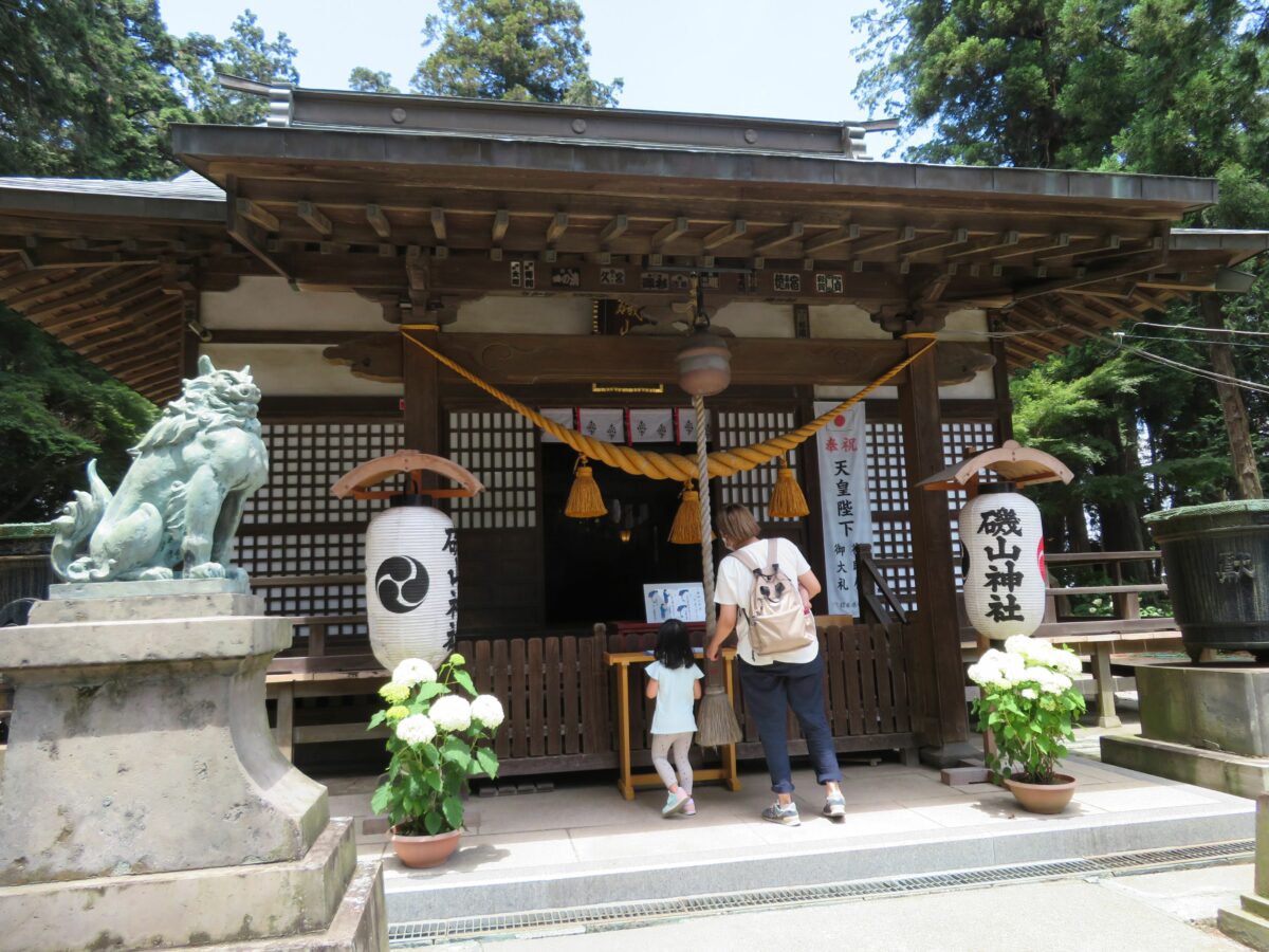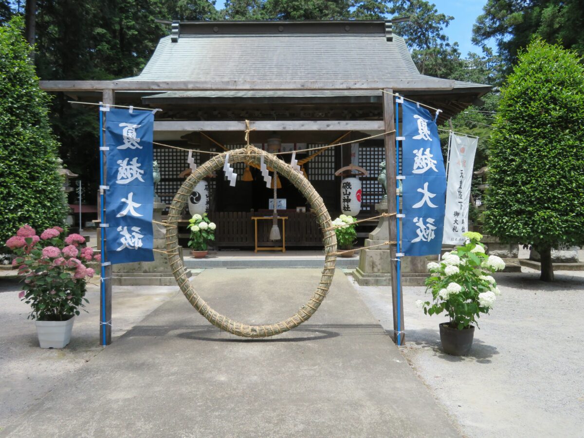 磯山神社の境内では創建1000年を迎える1988年の2年前からあじさいの植栽が始められました。鹿沼市に隣接する栃木市の太平山のあじさい坂の風景に触発されたのです。今では約28種、約2500株のあじさいが育ち、初夏には豊かな彩りを見せてくれます。境内では本殿を南側から豊かな彩りを添えています。