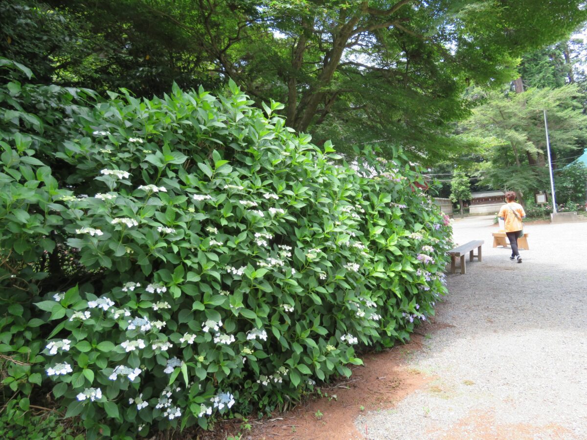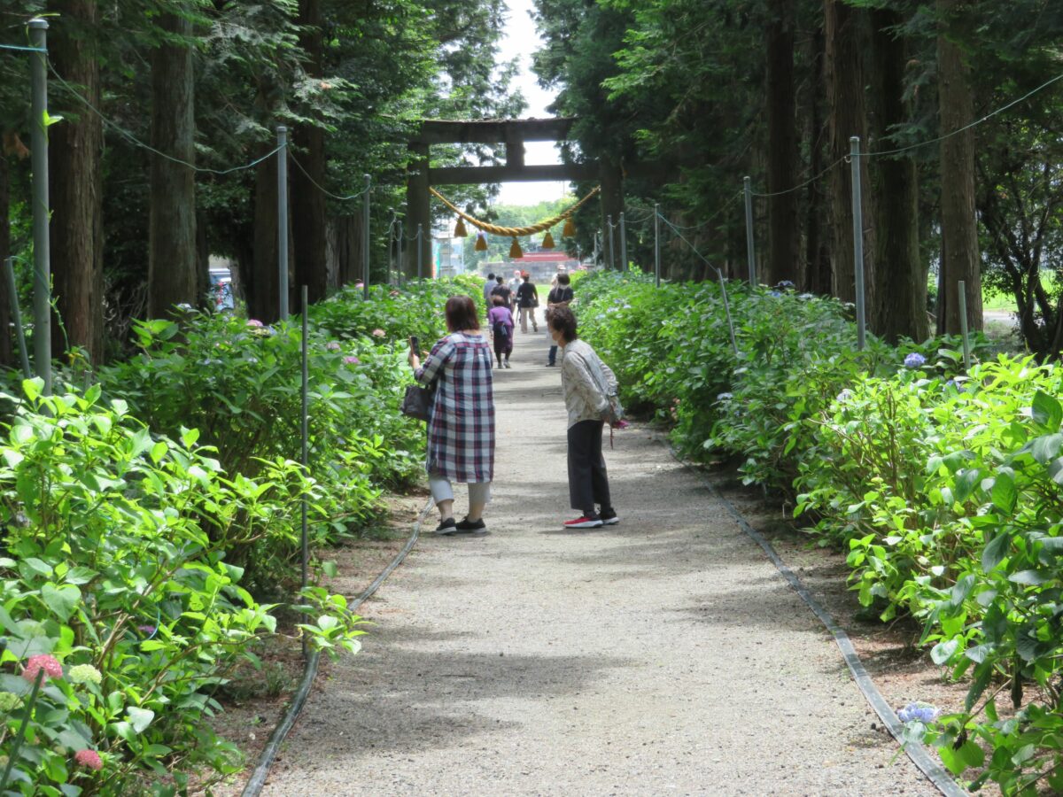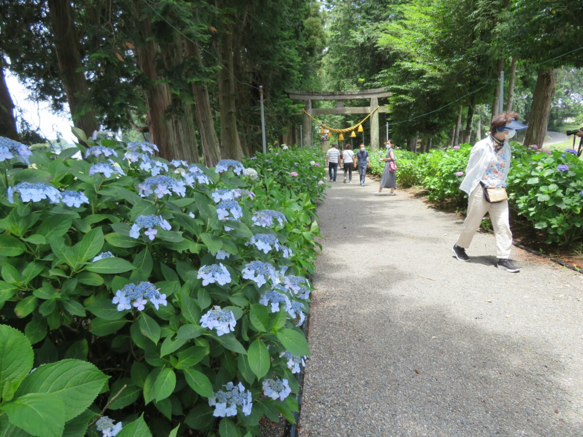 境内の南には神社の玄関の役割を果たす石灯籠まで、約180メートルの参道が繋がっています。幅1メートル足らずの参道には左右から色とりどりのあじさいが迫ってきます。あじさいの上は杉の緑で覆われ、あじさいの花と色彩のコントラストを見せてくれます。