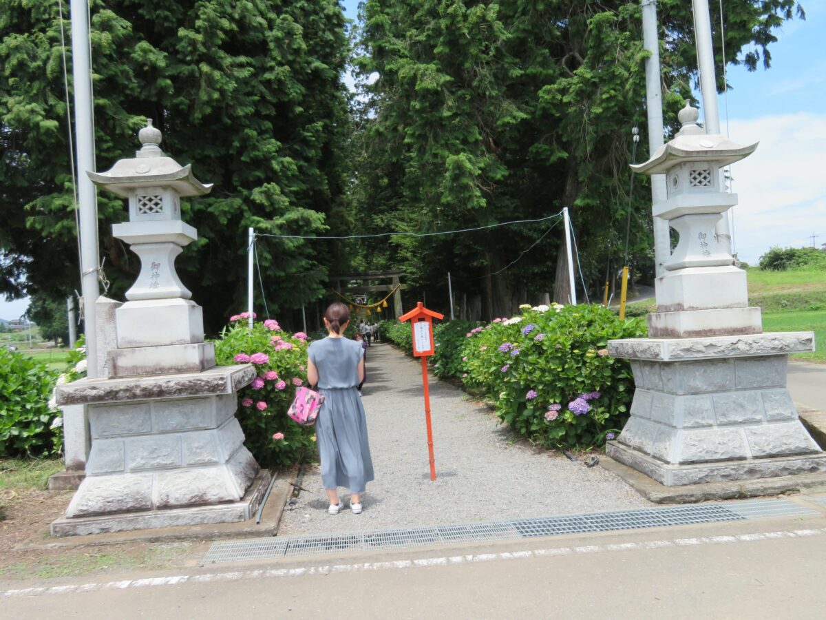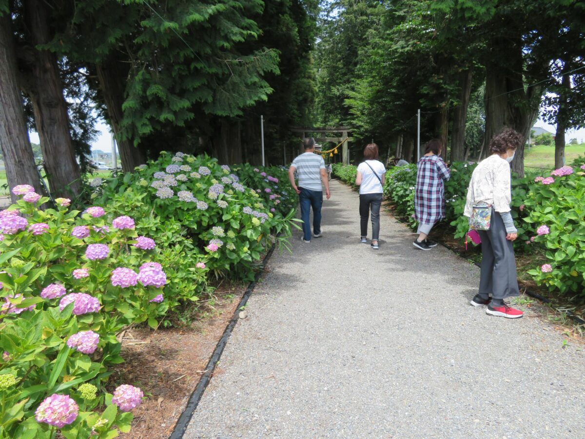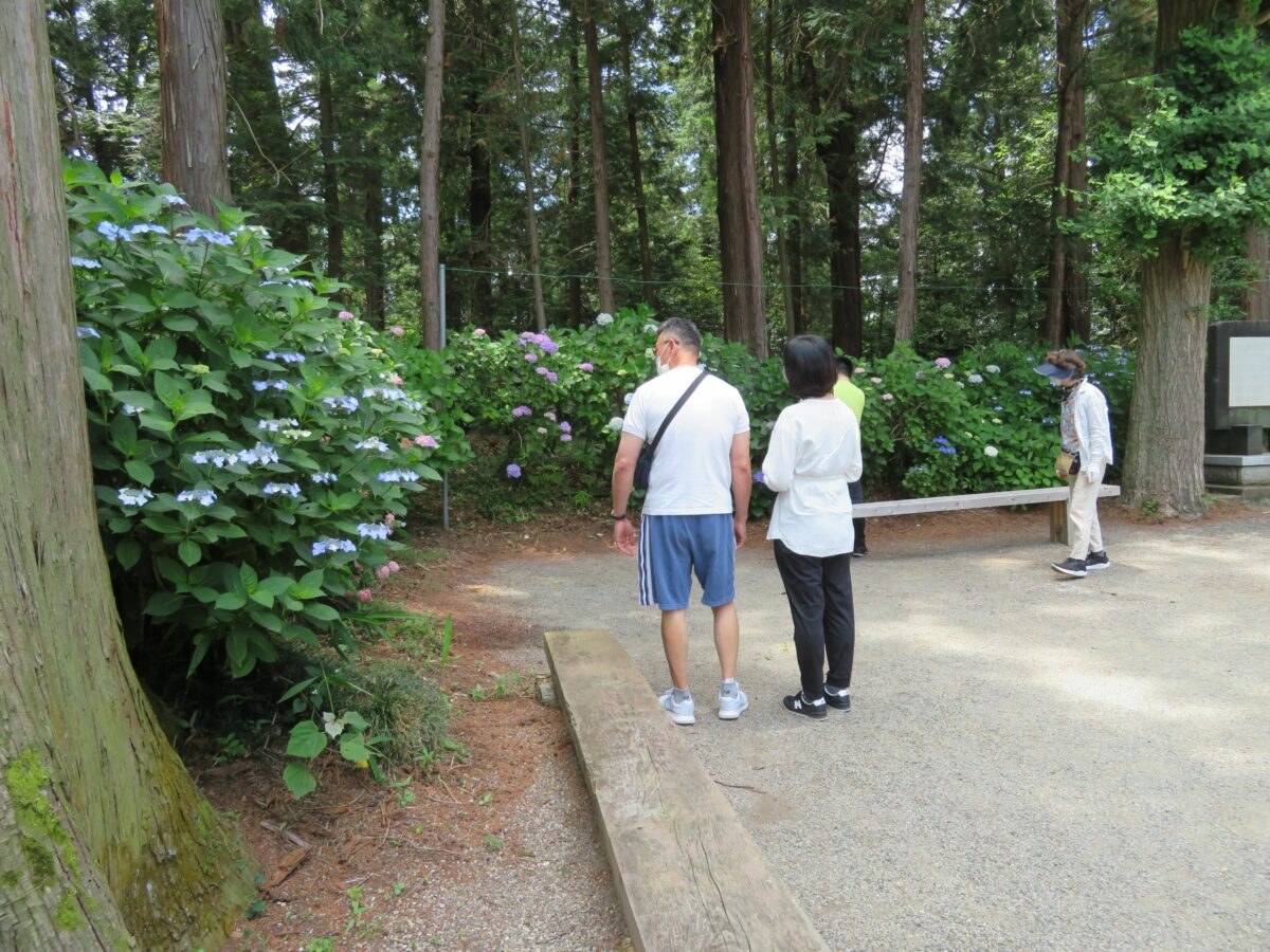 境内の南には神社の玄関の役割を果たす石灯籠まで、約180メートルの参道が繋がっています。幅1メートル足らずの参道には左右から色とりどりのあじさいが迫ってきます。あじさいの上は杉の緑で覆われ、あじさいの花と色彩のコントラストを見せてくれます。