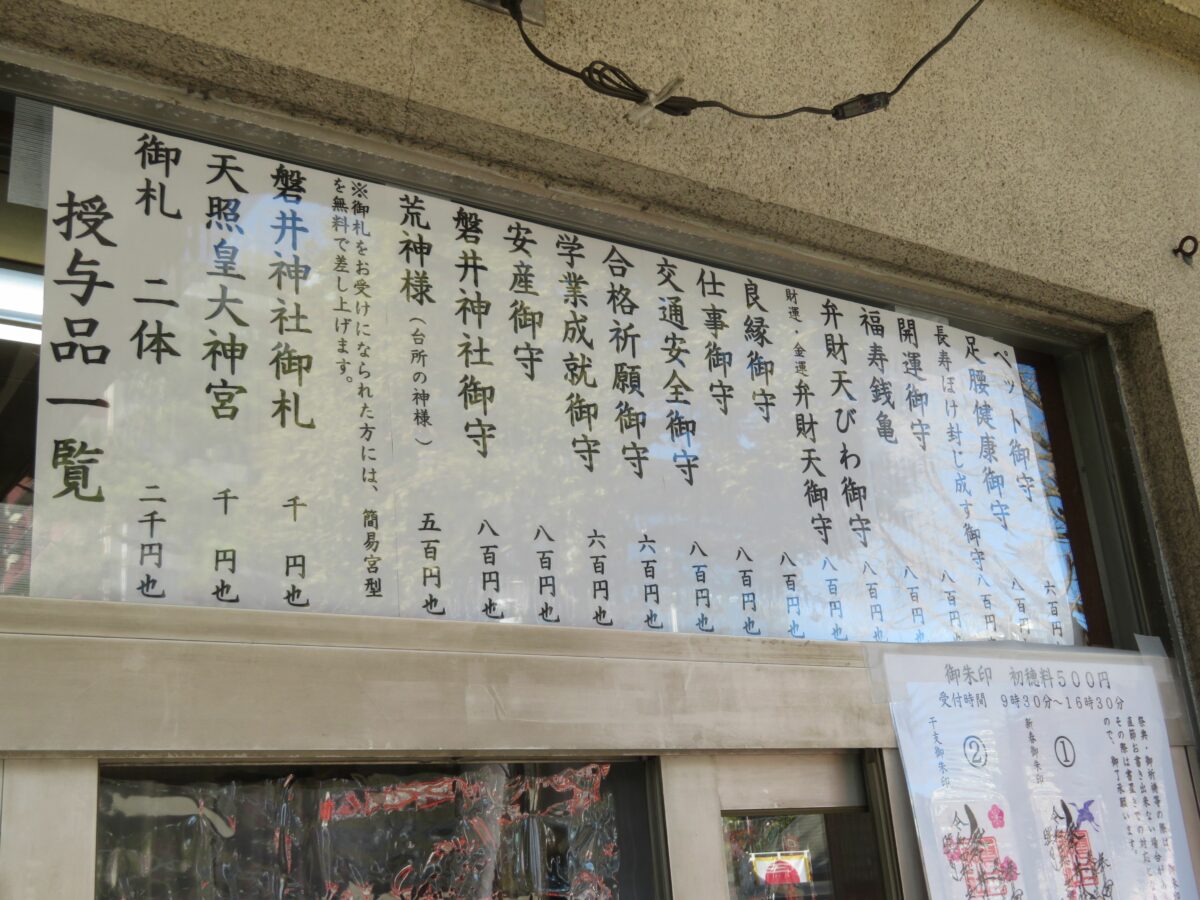 磐井神社では本殿の西に隣接する社務所で、御朱印を頂くことができます。窓口にはオリジナルの御朱印帳やお守りなどの授与品が並んでいます。