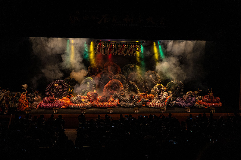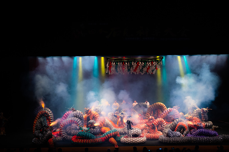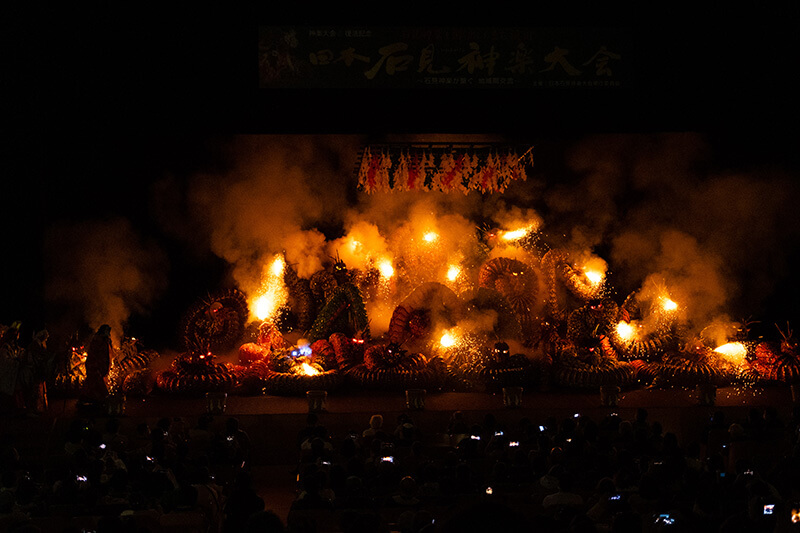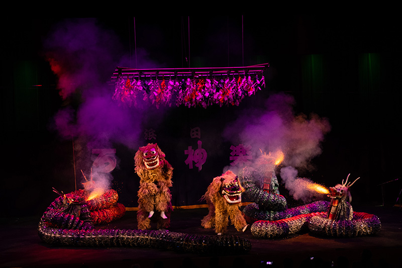 照明が落ちた中、緞帳がゆっくりと上がると、そこには30体の大蛇の目が暗闇に浮かびます。この日一番の歓声が上がる中、ステージを所狭しと大蛇がのたうちます。立ち込める煙幕、飛び散る火花・・・。これぞ石見神楽というべき圧巻の舞が披露されました。