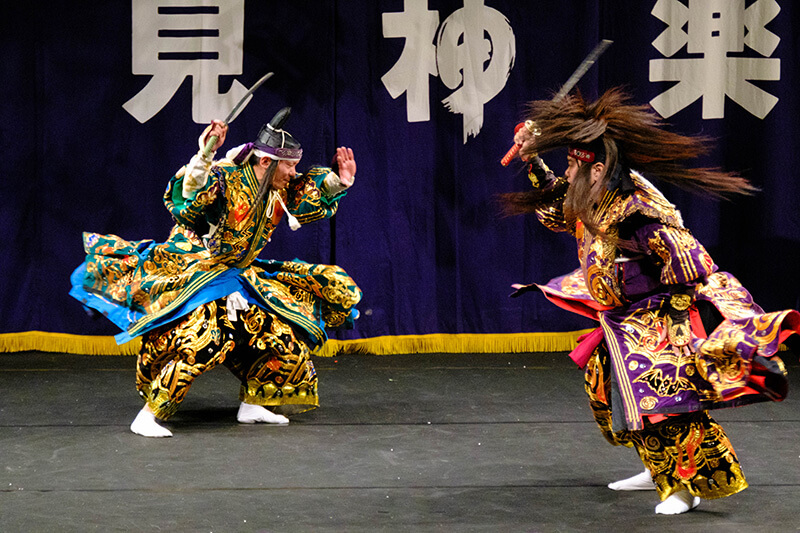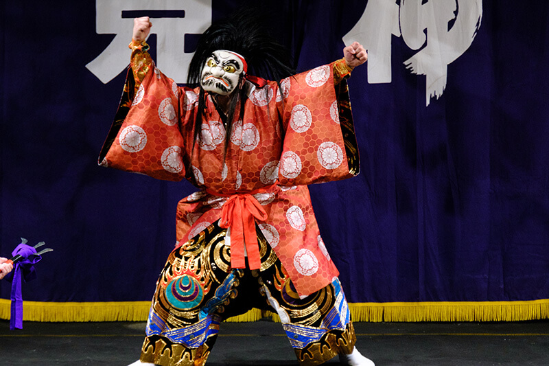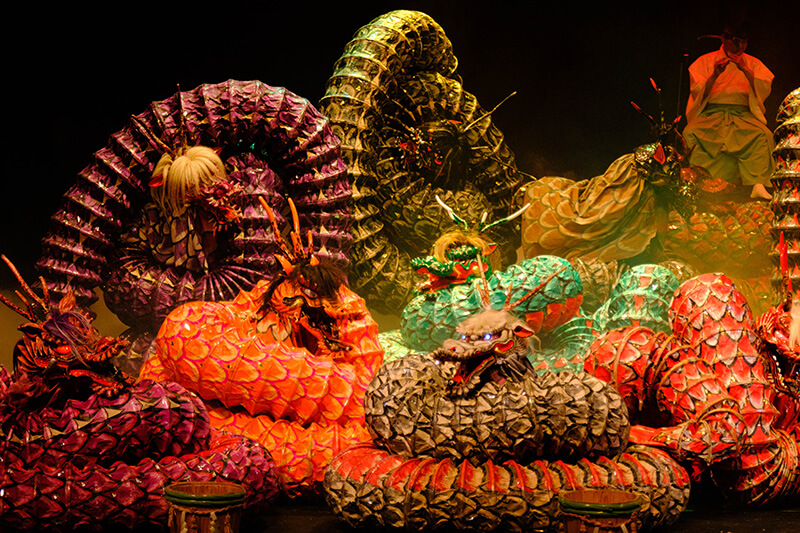 「大蛇」は、石見神楽の代名詞とも言える演目。須佐之男(すさのお)による八岐大蛇(やまたのおろち)退治伝説を元にした物語です。浜田市で開発された提灯型の蛇胴を用いた大蛇がステージを所狭しとうねり、火花を吐きます。