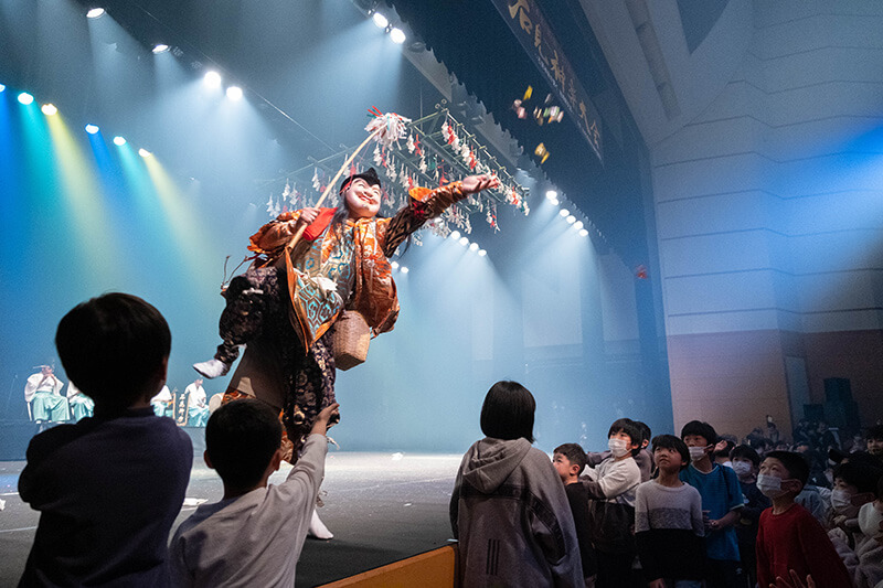 大蛇の余韻の中、カーテンコールは「恵比須」。地元では結婚式などで披露されるめでたい舞です。現れた恵比須様が、愉快に舞いながら客席に福飴を投げ入れます。ステージ前には子どもたちの笑顔が集まります。見事に鯛を釣り上げた恵比須様に招かれ、櫨山会長、久保田市長や社中代表者がステージに上がり、感謝を込めて観客席に餅を撒きます。