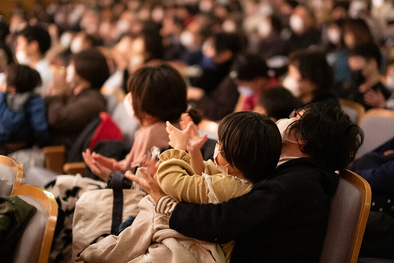 一方、開演が近づき、ホール内はあわただしくなります。感染対策に置かれた消毒液のチェックや、音響、セットの確認。出番を待つ演者の皆さんも、バックヤードをソワソワと歩き回っています。
