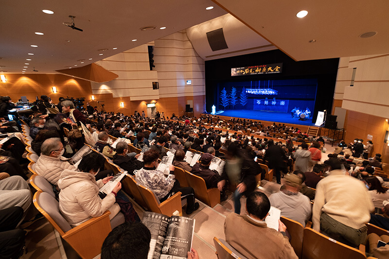 2023年3月5日(日)、島根県浜田市黒川町にある石央文化ホールにて「石見神楽を創り出したまち浜田 日本石見神楽大会」が開催されました。 「日本石見神楽大会」は、浜田市内11の社中からなる浜田石見神楽社中連絡協議会による年1回の大規模な定期公演です。1990年に、旧浜田市制50周年行事として始まった大会ですが、2020年大会が新型コロナウイルス感染症の蔓延により中止となったためにおよそ3年にわたって開催が見合わされていました。今春、ようやく29回目の大会実行の見通しが立ち、社中の皆さんはじめ、浜田市民の誰もがこの日を待ちわびていました。