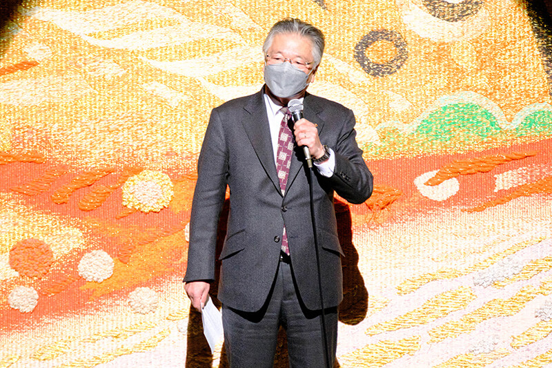 幕間で挨拶に立った大会実行委員会の櫨山陽介会長は、「今大会は、世界に誇れる石見神楽を継続的に演じていこうという考えのもと1990年から続くものです。残念ながら過去3年は開催できていませんでしたが、2022年、初めての東京・国立劇場公演成功の凱旋としても、ぜひとも地域の皆さまに神楽を見ていただきたいという気持ちでこの日を迎えています」と今大会の意義を述べます。