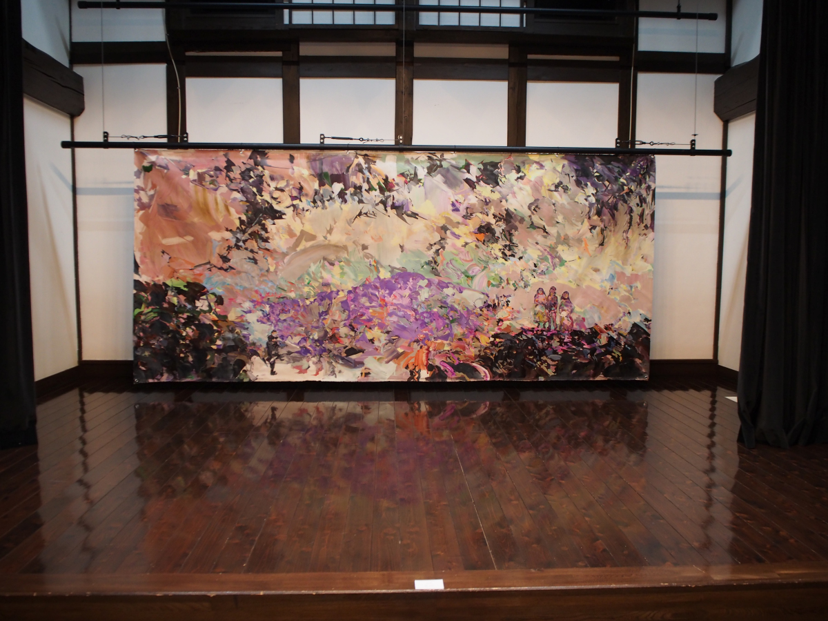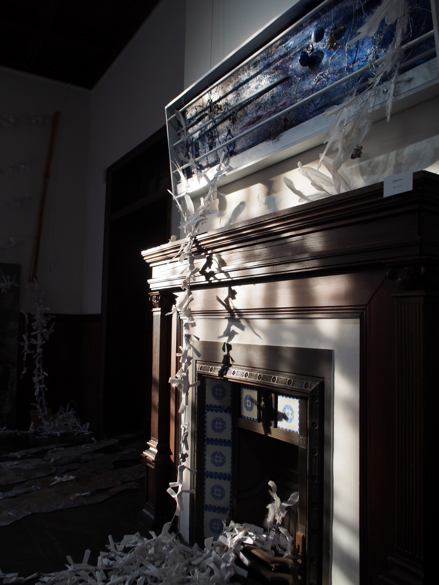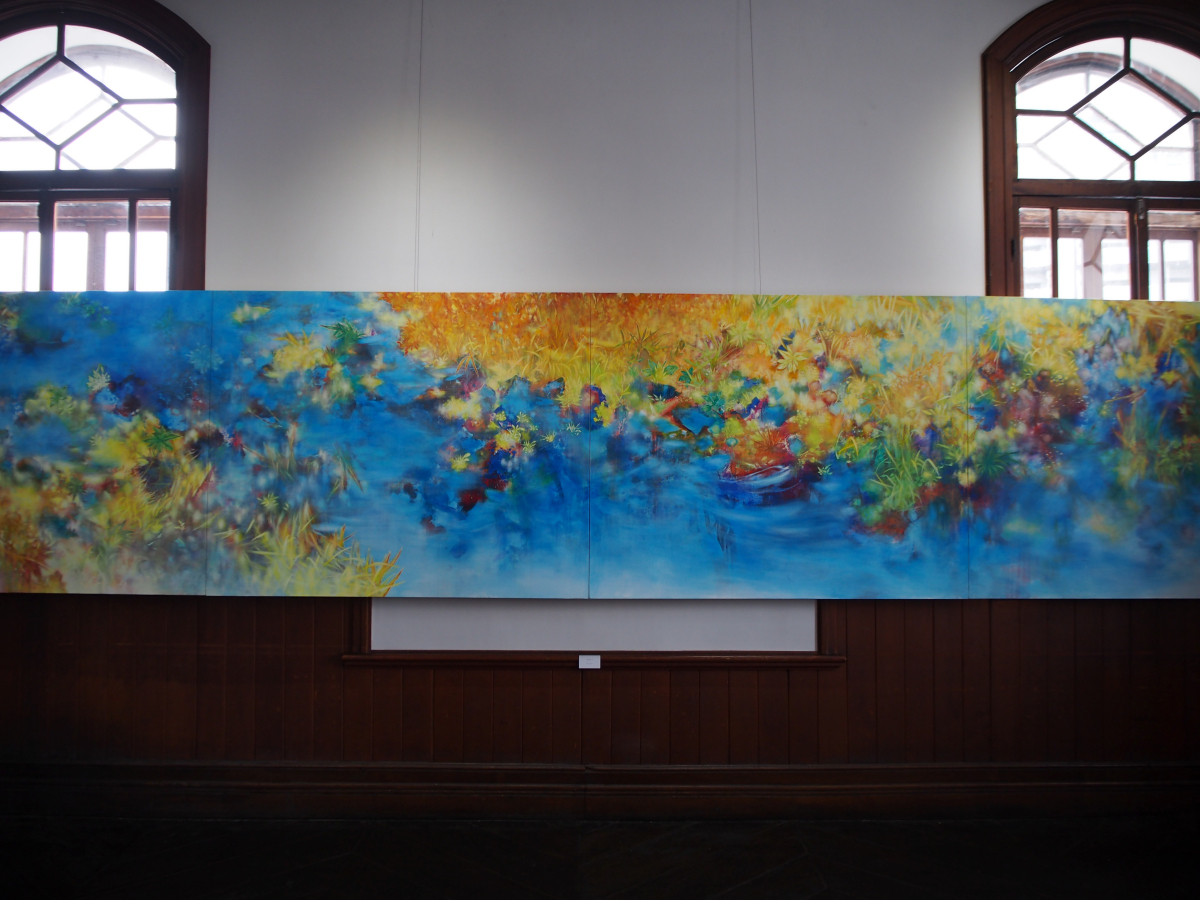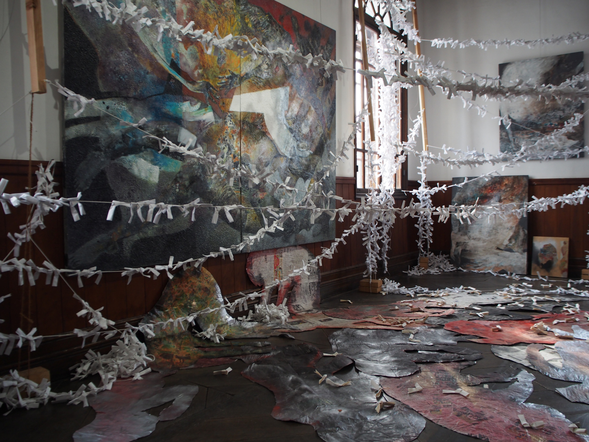 油絵と現代アートを組み合わせるに至っては、空間を表現させる為に窓を活さないといけない。作品と窓が相乗効果を生まないといい作品にならない。その為に、窓からの外光を活かした。