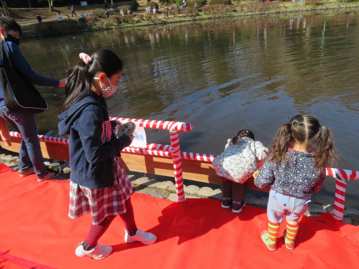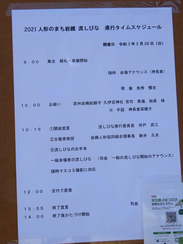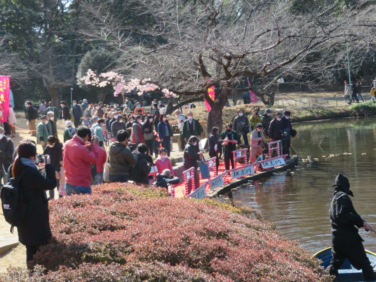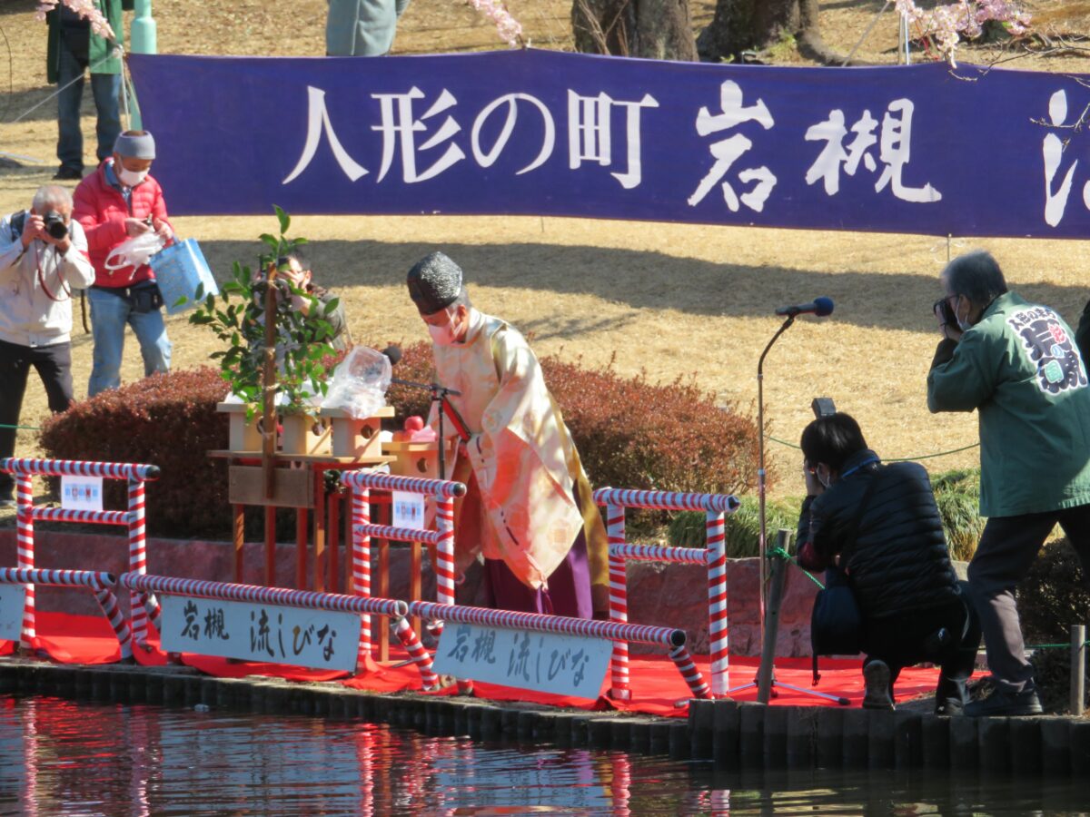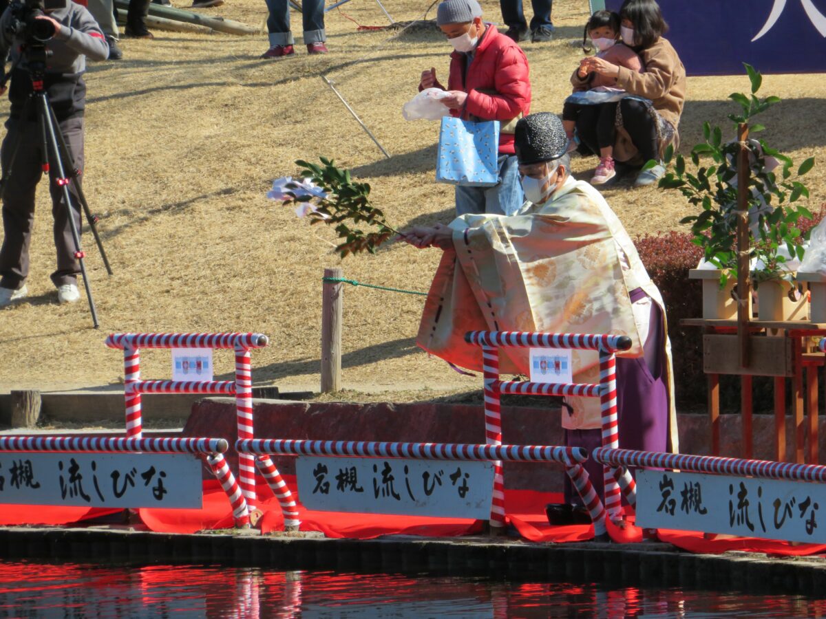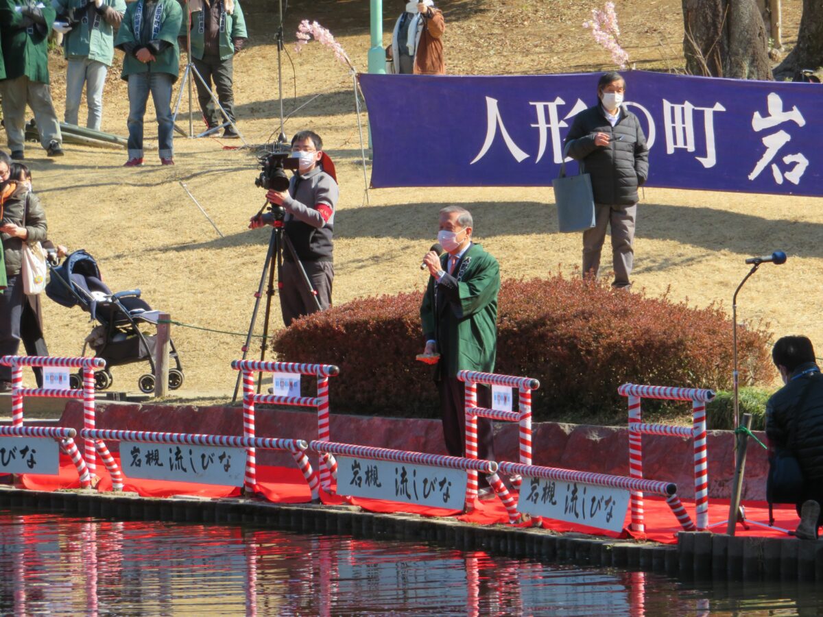 2021年の「岩槻流しびな」は、2月28日の10:00~14:00に実施されました。10:00になると菖蒲池沿いのステージに久伊豆神社の宮司が現れ、祝詞(のりと)の奏上、榊を振ってのお祓いが行われます。続いて開会が宣言され、「岩槻流しびな」が始まります。
