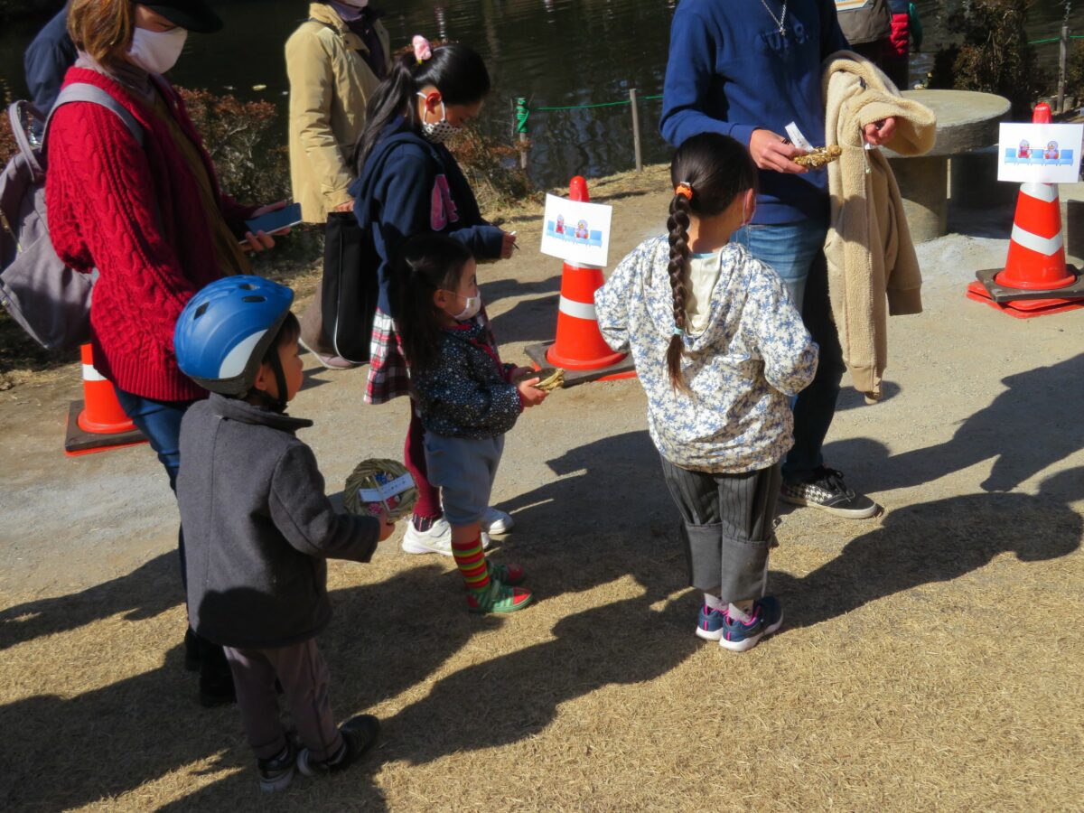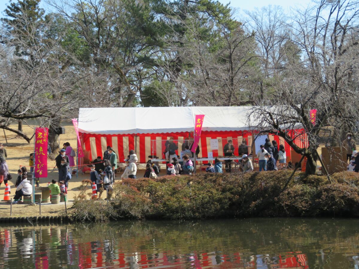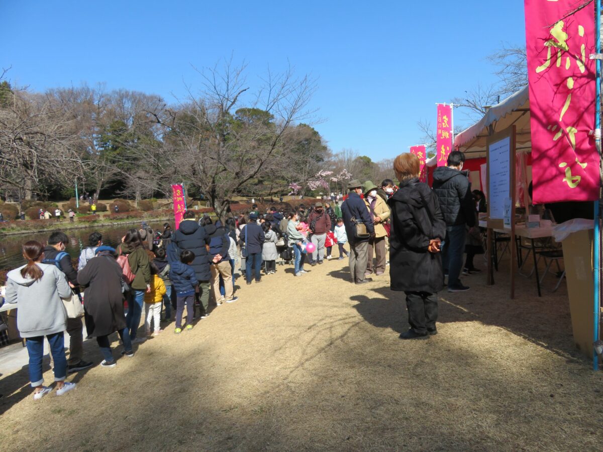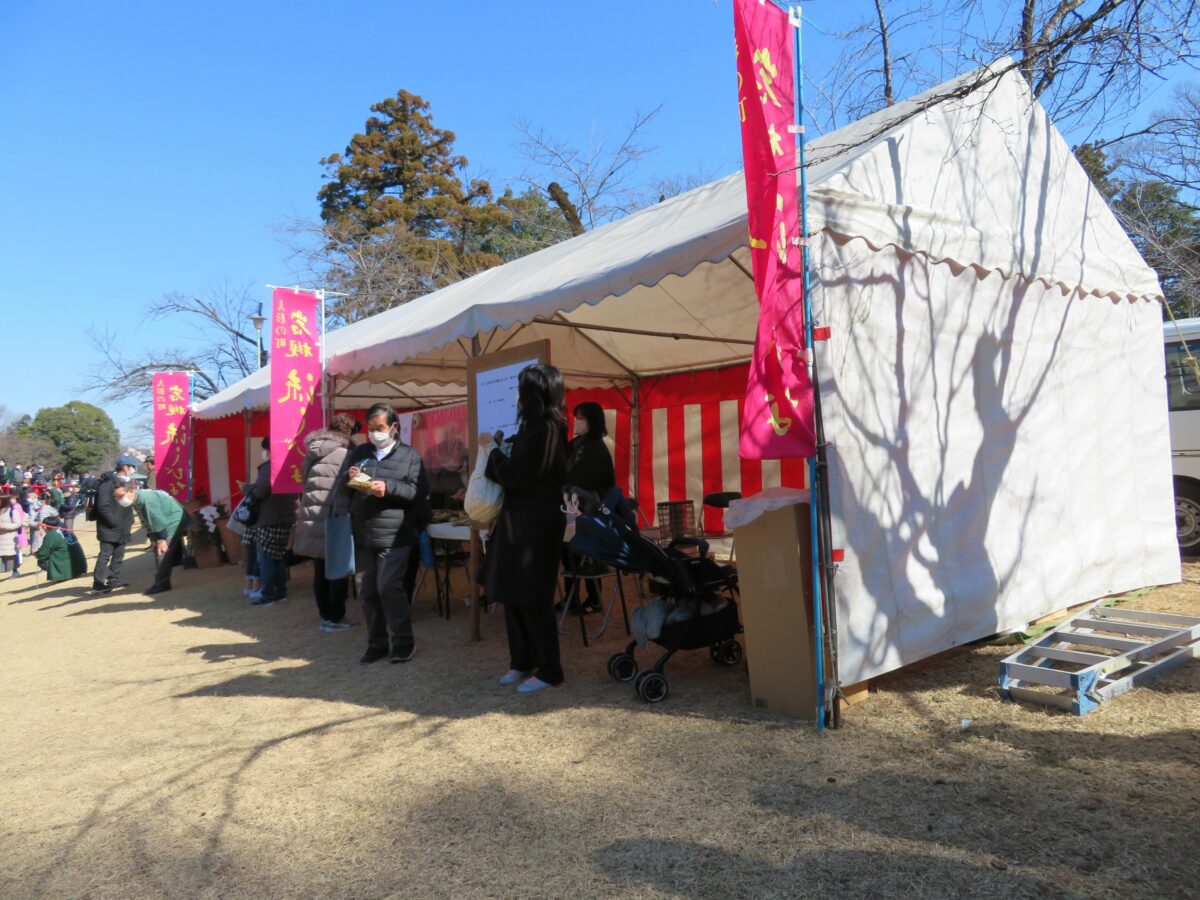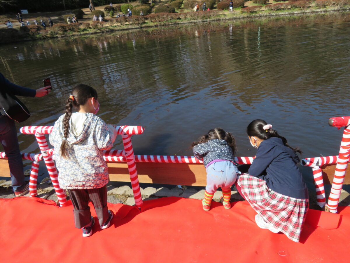 2021年の「岩槻流しびな」は、2月28日の10:00~14:00に実施されました。10:00になると菖蒲池沿いのステージに久伊豆神社の宮司が現れ、祝詞(のりと)の奏上、榊を振ってのお祓いが行われます。続いて開会が宣言され、「岩槻流しびな」が始まります。