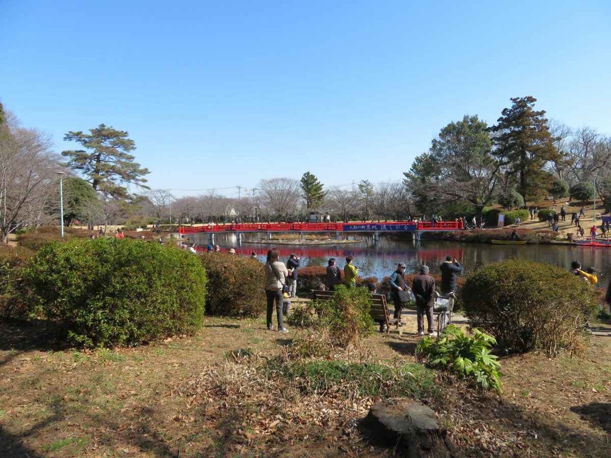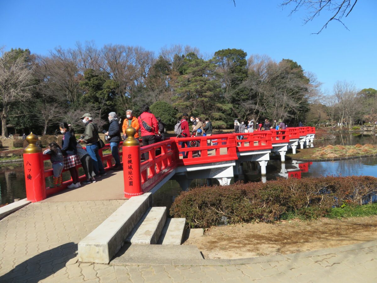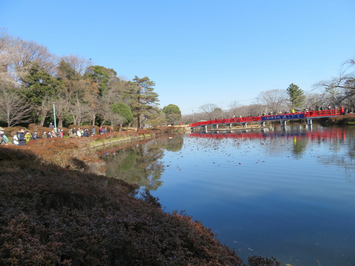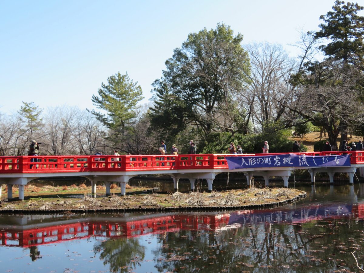 「岩槻流しびな」が開催されるのは、岩槻駅から東に約1.5キロの岩槻城址公園です。公園の中央では菖蒲池が穏やかな水面を湛え、鮮やかな朱色の八ツ橋が架けられています。