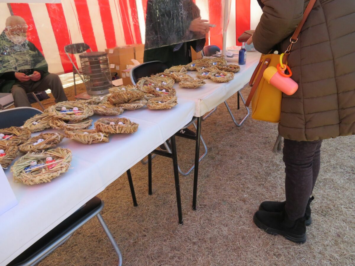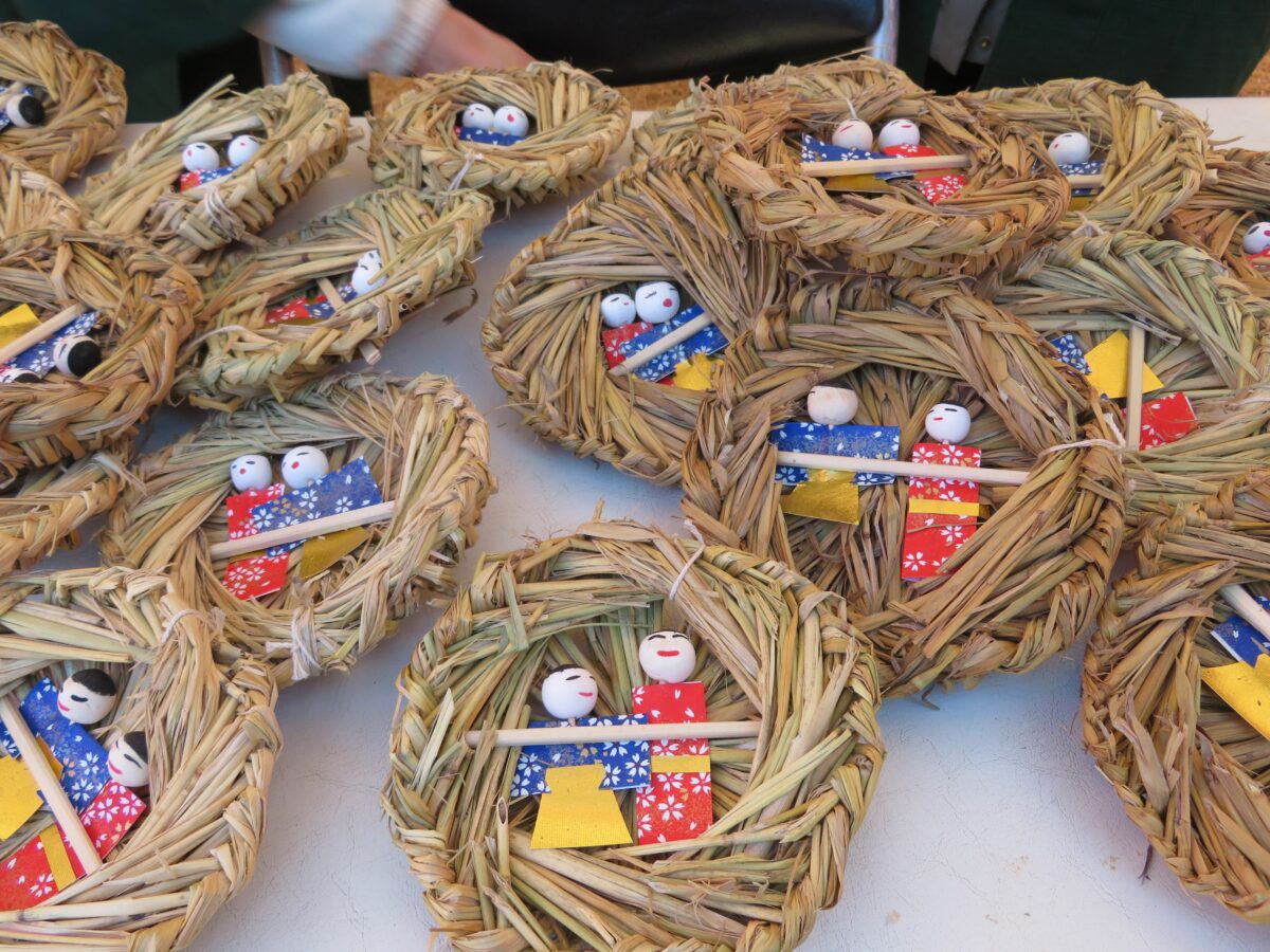 「岩槻流しびな」では、藁で編んだ直径約12センチの円形の台盤に、和紙で作られたひな人形が乗せられた「さん俵」が準備されています。これを流すことによって、子どもの無病息災を願うのです。「さん俵」は、菖蒲池沿いに設置された特設のテントで手に入れることができます。来場者は先ずテントで「さん俵」を買い、行列に並ぶことになります。