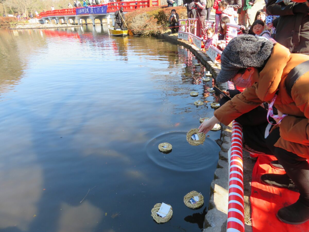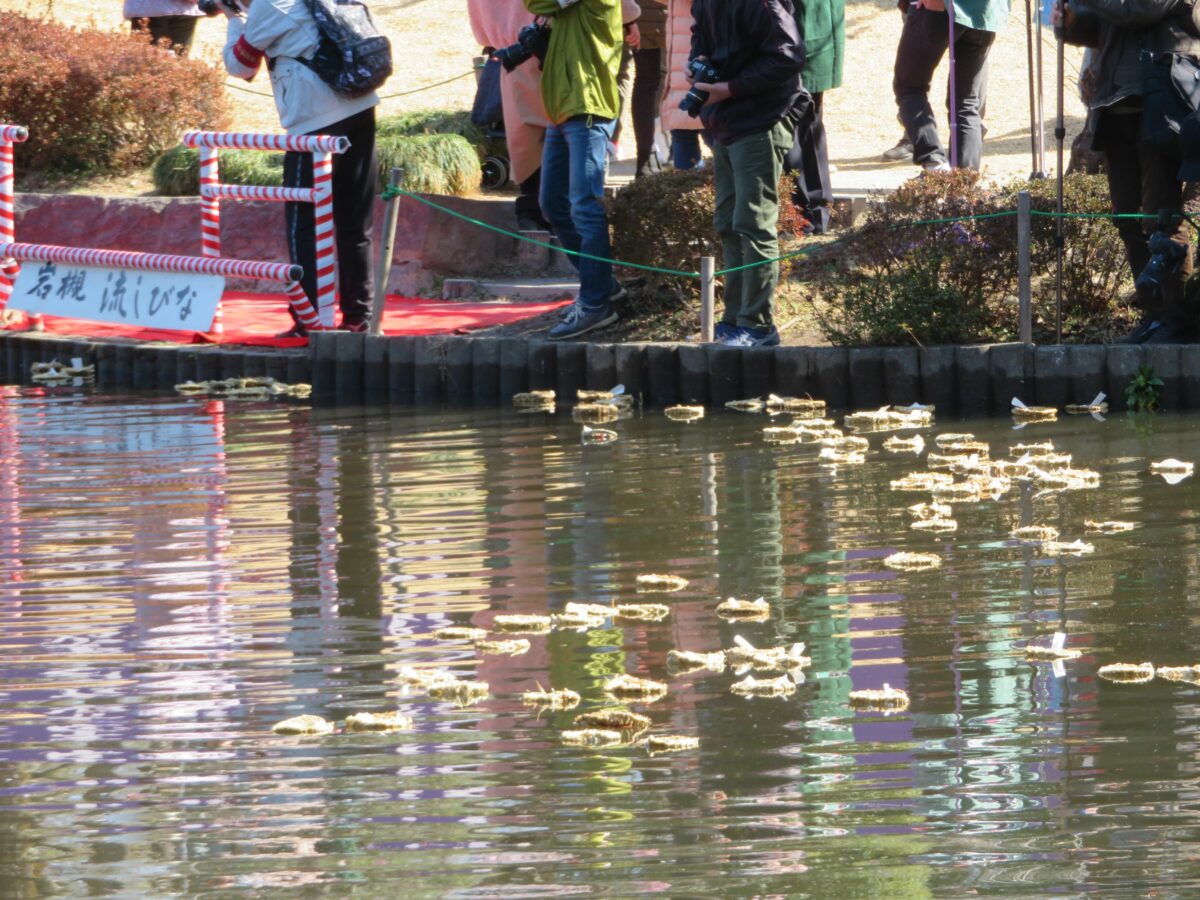 さいたま市の岩槻区では江戸時代から人形作りが盛んに行われています。女の子の健やかな成長を願う「桃の節句」の直前の日曜日に「岩槻流しびな」が開催され、岩槻城址公園の菖蒲池に「さん俵」を流します。