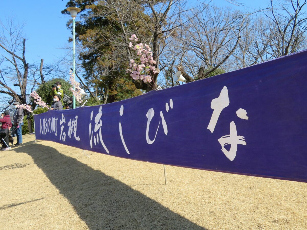 岩槻城址公園の中央に掲示される「岩槻流しびな」の横断幕