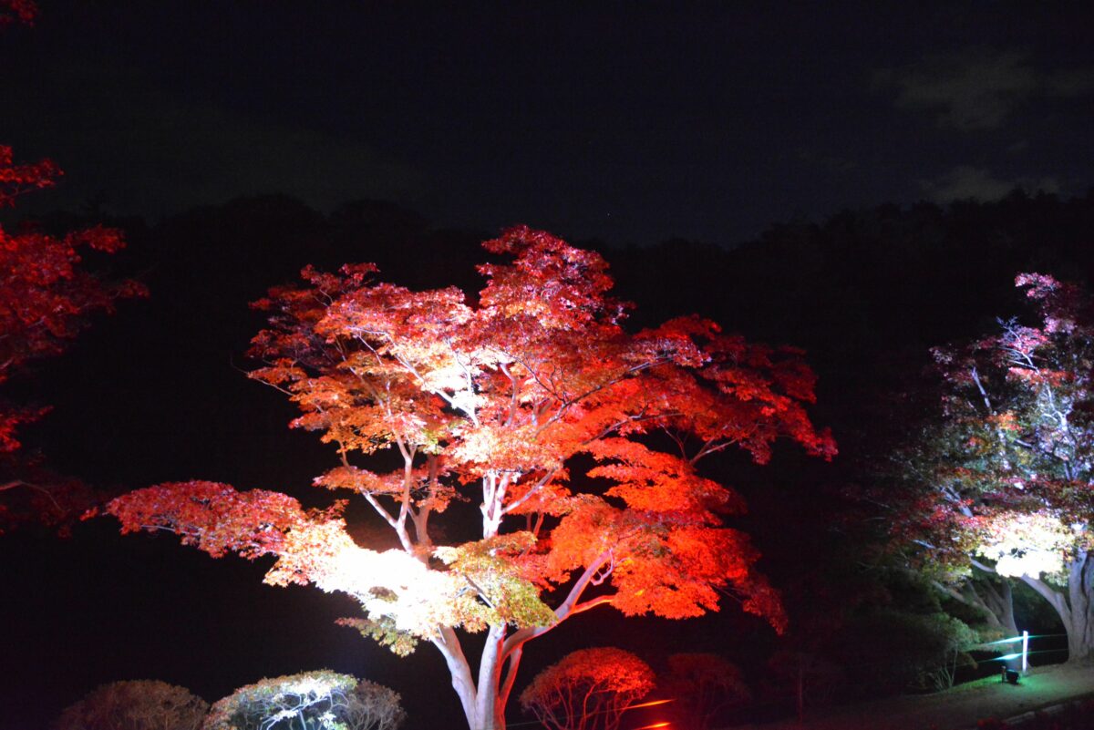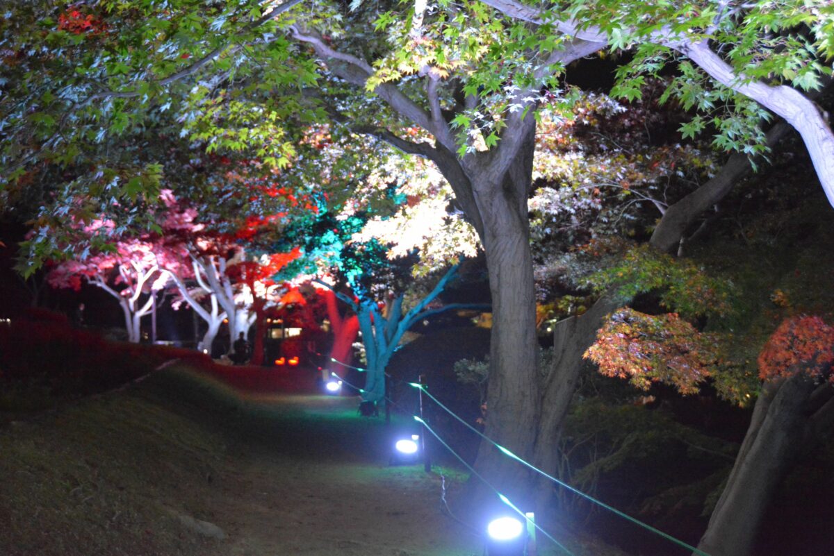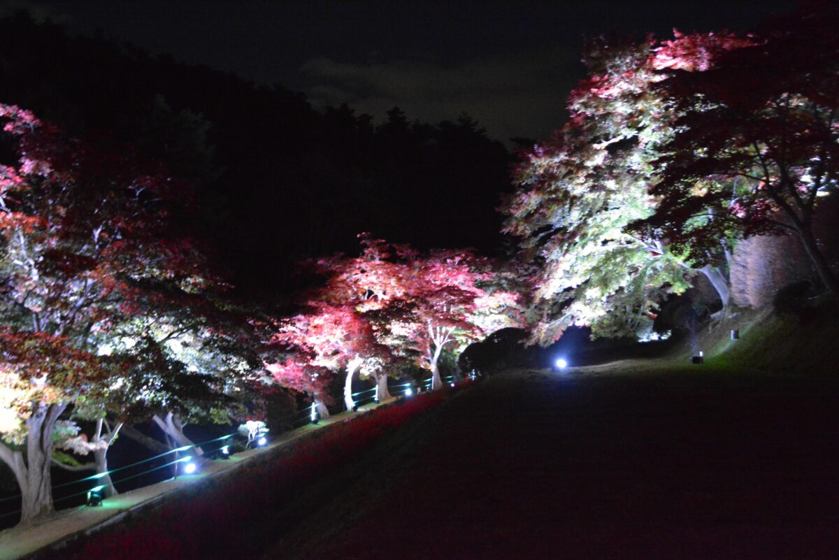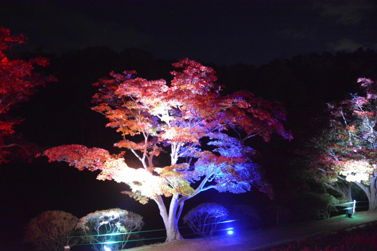 「蛇の鼻もみじ祭り」の開催期間中には、夜間のライトアップも行われます。2021年は11月1日~14日の夜、紅葉が和かな光で照らし出されました。中には時間とともにゆっくりと色彩を変えるライトもあり、変化に富んだ紅葉の彩りを楽しむことができます。