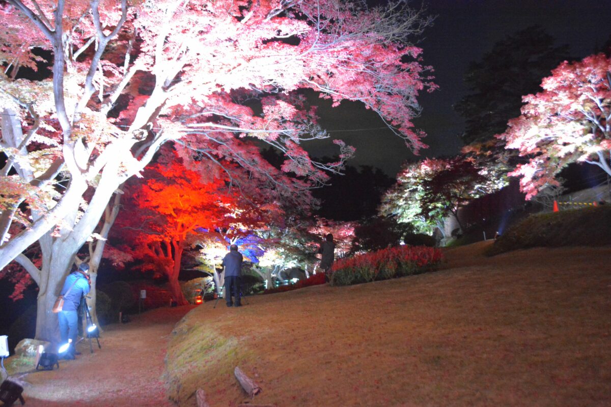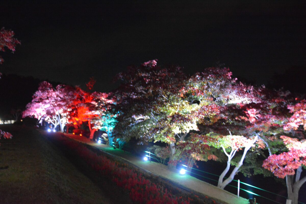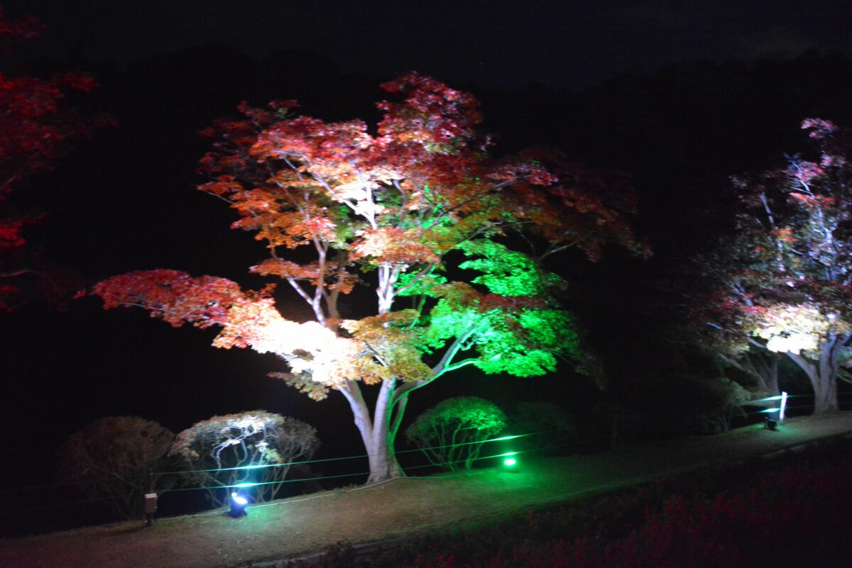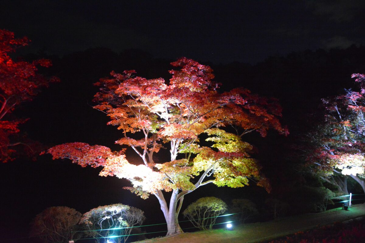 「蛇の鼻もみじ祭り」の開催期間中には、夜間のライトアップも行われます。2021年は11月1日~14日の夜、紅葉が和かな光で照らし出されました。中には時間とともにゆっくりと色彩を変えるライトもあり、変化に富んだ紅葉の彩りを楽しむことができます。