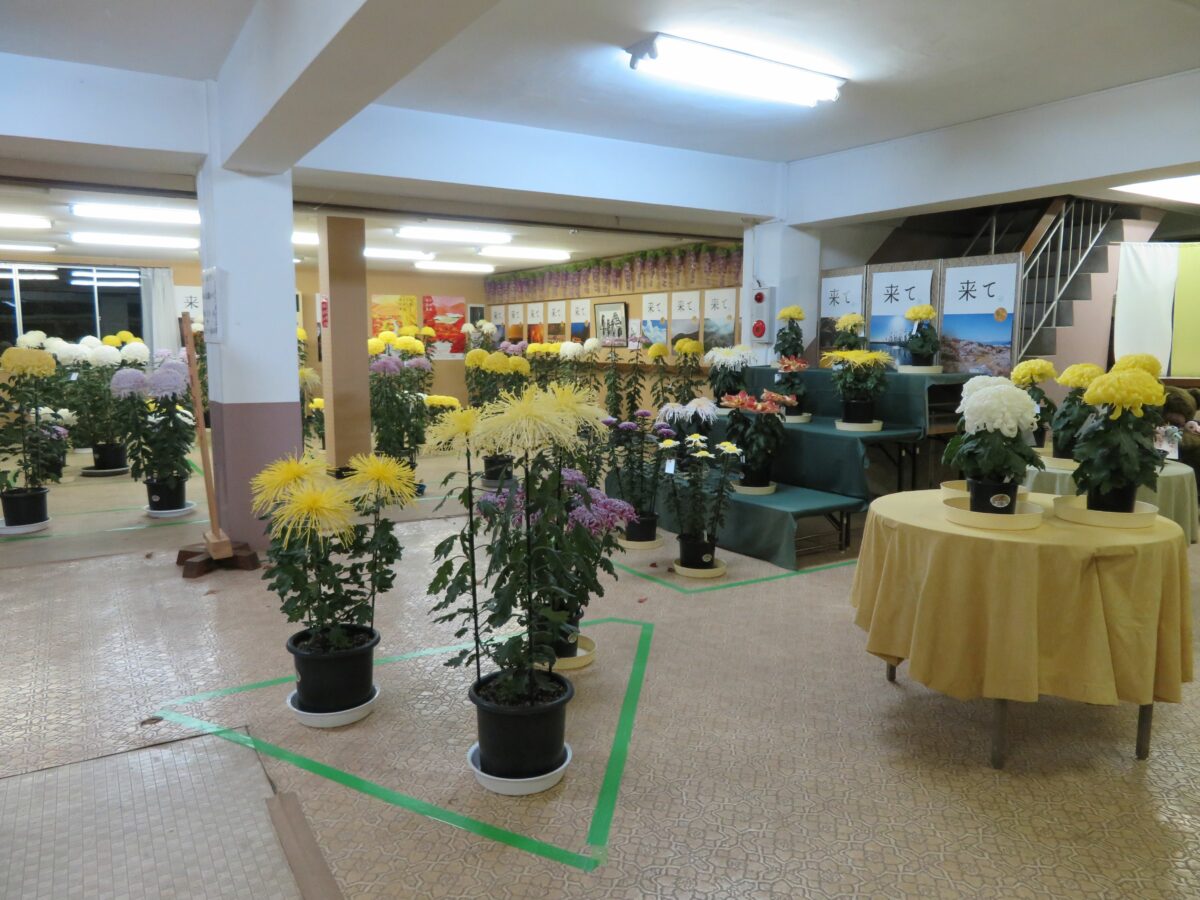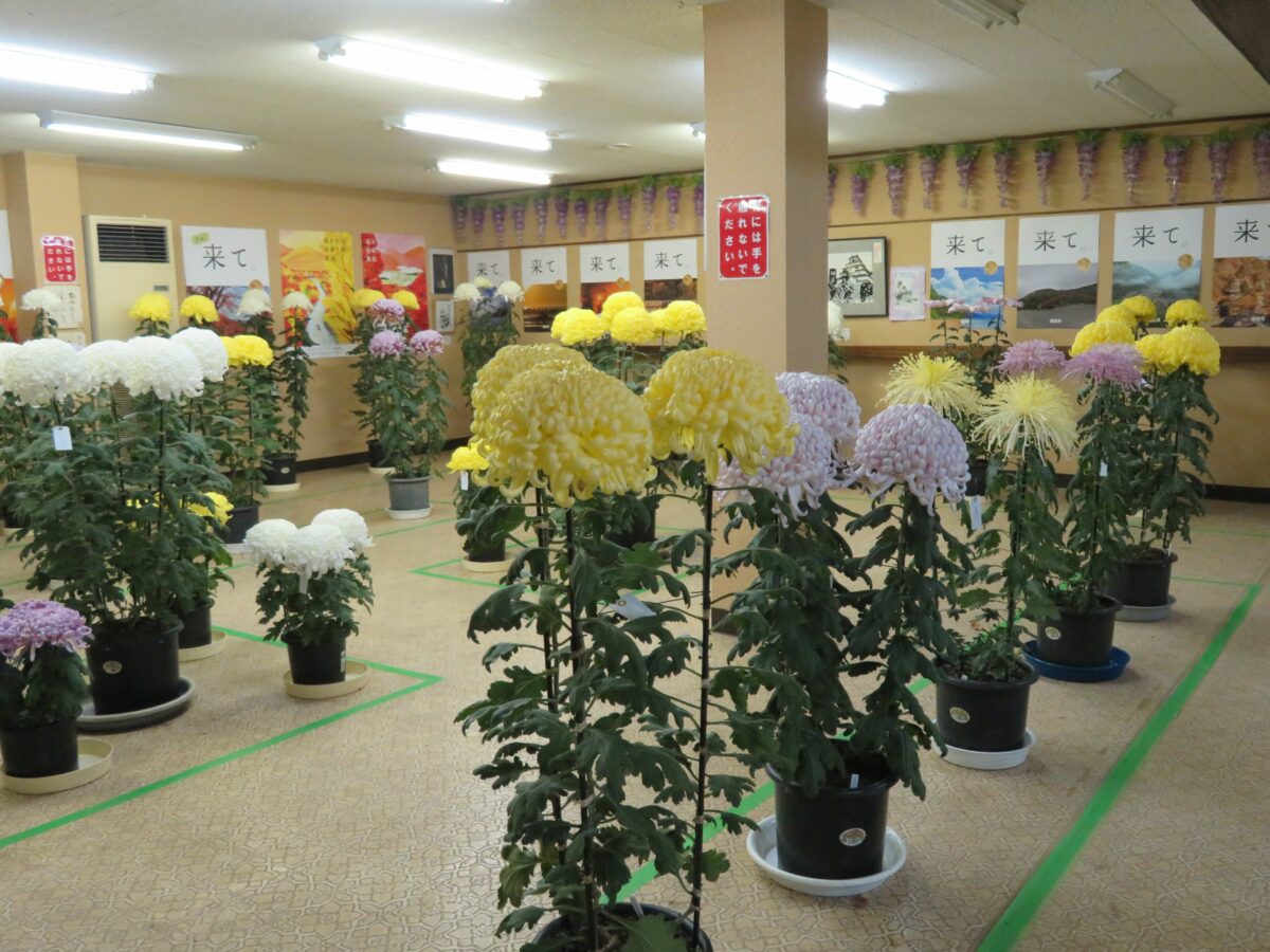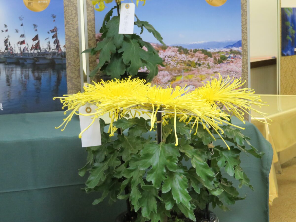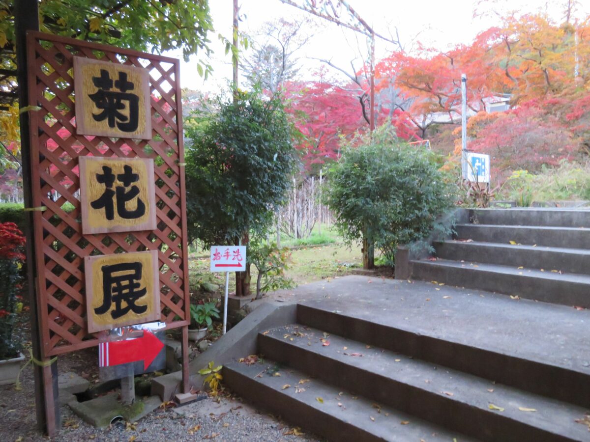 「蛇の鼻もみじ祭り」の演出はライトアップに留まりません。擂鉢池の北に接する蛇の鼻茶屋の正面に設けられたレストハウスの2階で菊花展が行われるのです。会場いっぱいに大輪の菊の花が溢れる中、「一文字」や「管物」と呼ばれる菊も展示され、様々な種類の菊を楽しむことができます。