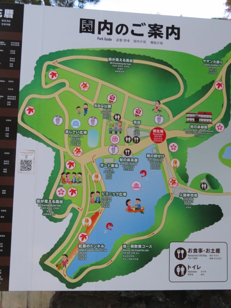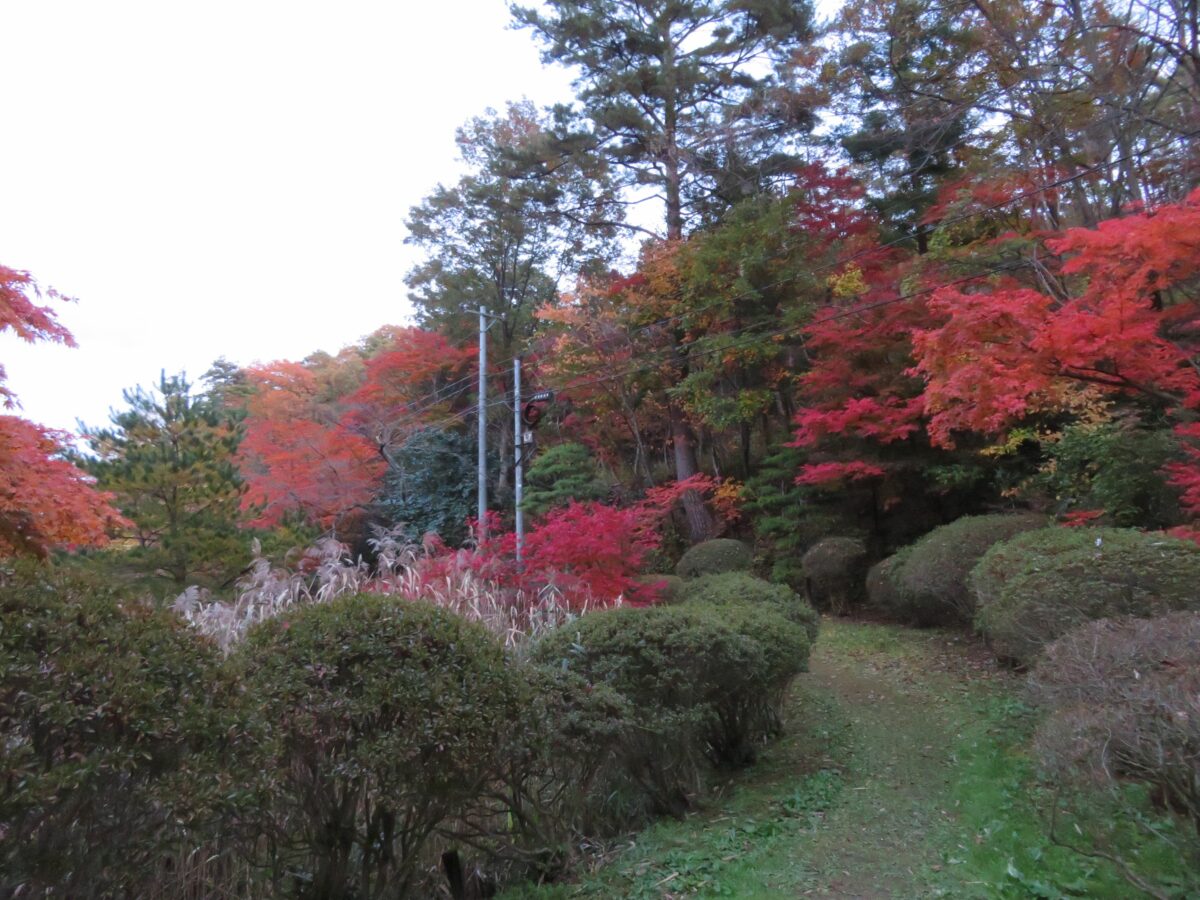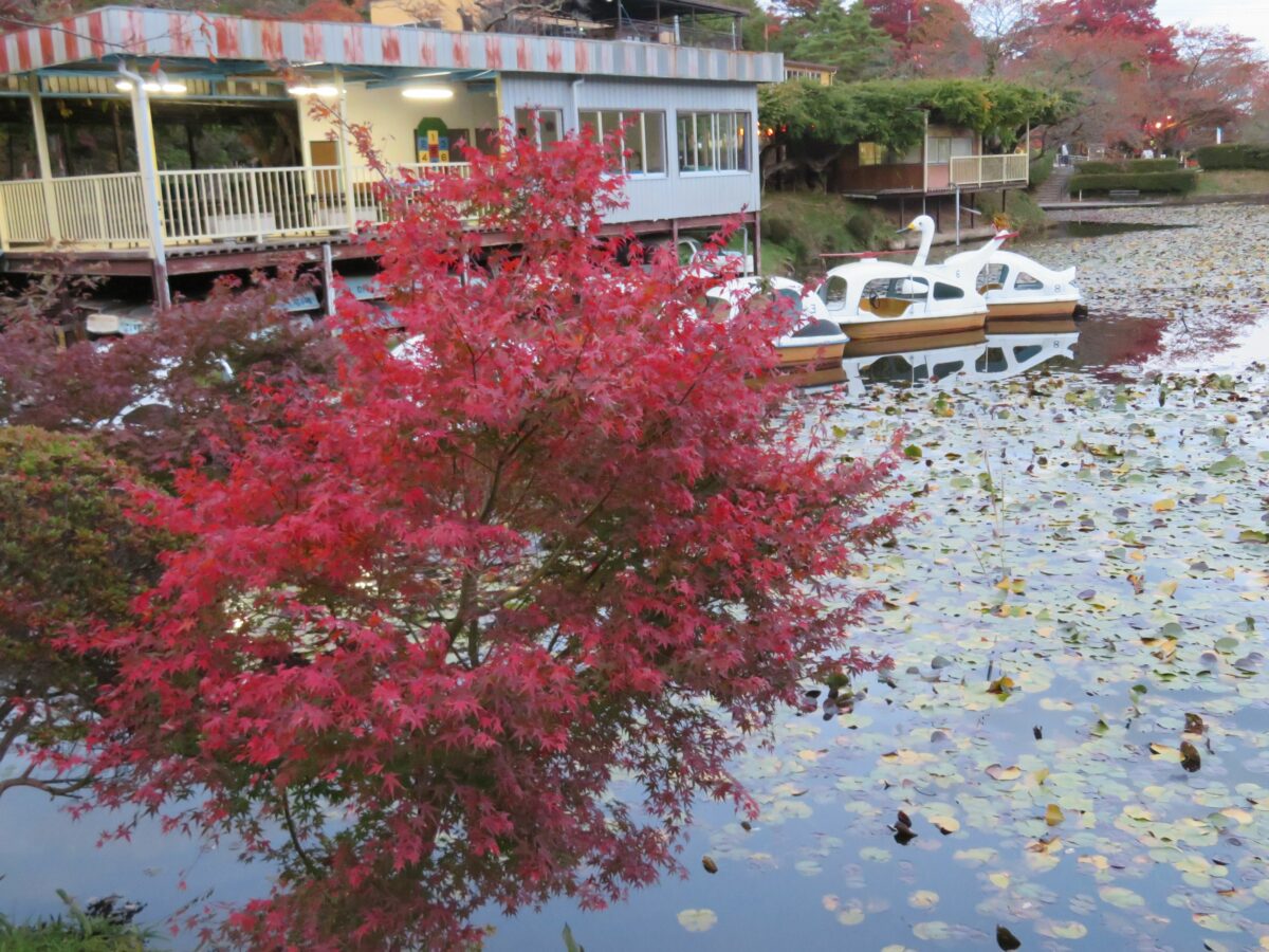 花と歴史の郷「蛇の鼻」には約500本のカエデが育てられています。大半は蛇ノ鼻百果園の開園の時期に植えられ、樹齢は100年を超えます。幹回り2メートル近くに成長した大樹も数多く見られるのです。特に擂鉢池の西岸の遊歩道は紅葉コースとなり、頭上は真赤な紅葉で覆われます。