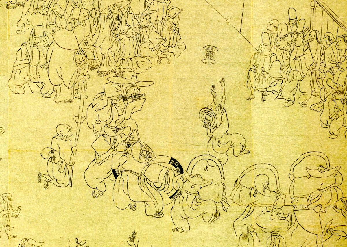 あまり知られていない事例としては『鳥獣戯画』。カエルとウサギで有名な『鳥獣戯画』にも、当時の田楽法師の様子が描かれている。