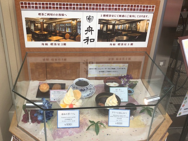 2階は喫茶店になっていて、ショーケースの中に芋パフェやくりーむあんみつが。