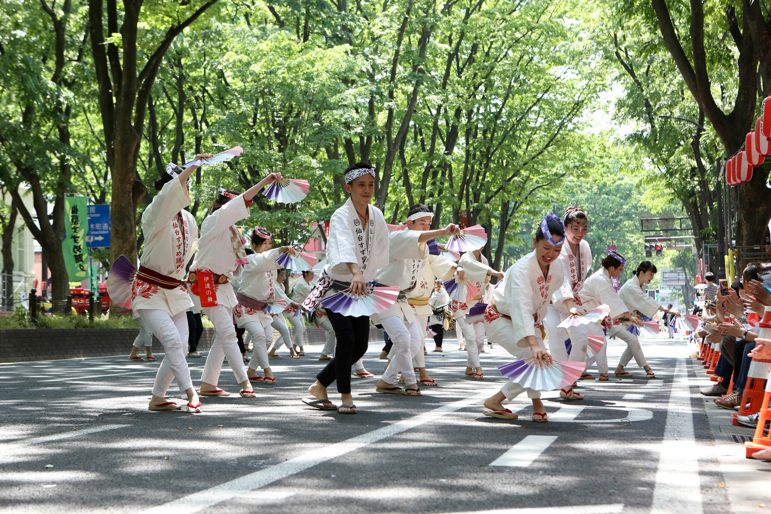 見どころは宮城野通り約200メートルをいっぱいに使った「大流し」。約60団体、2000人の踊り手が共通のお囃子にアレンジを加えながら、趣向を凝らした衣装と振り付けで踊りを披露してゆく。また特設会場ステージや、ステージに見立てた路上を使って披露される演舞ではより自由度が高くなるので、祭連ごとの特徴が際立つステージに! そして夜のフィナーレでは祭連と観客が一緒になって踊る「総踊り」で会場は大盛り上がり。個性豊かな団体、演舞の違いに注目しながら観て欲しい。