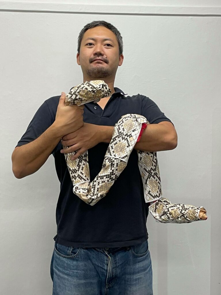 【屋根裏のアミメニシキヘビを捕まえた園長さん】