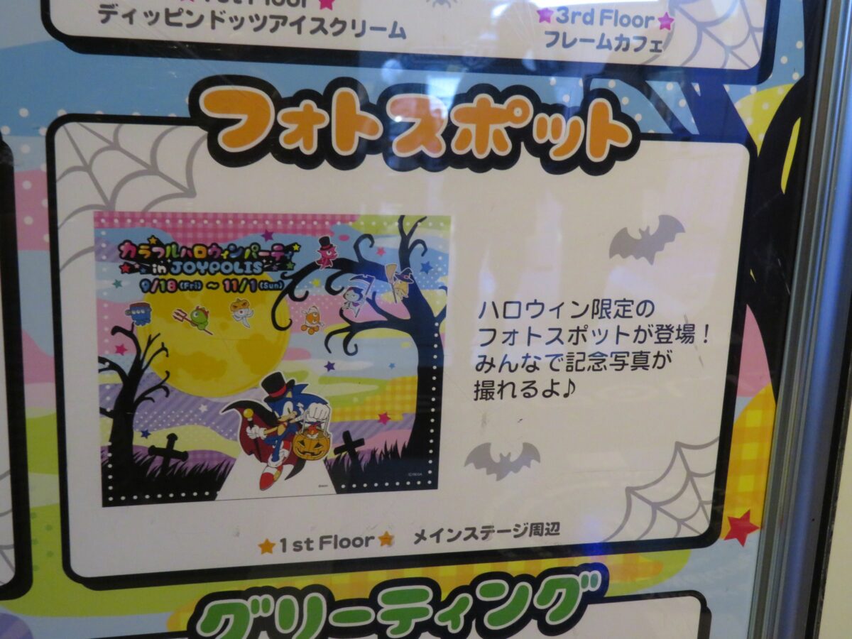 2階の「ソニックカーニバル」の中心では、セガの人気キャラクター「ソニック」が「ジャック・オー・ランタン」を手にしています。セガのアクションゲーム「ソニック・カラーズ」の発売10周年を記念してコラボしているようです。また、「ハロウィンソニック」のぬいぐるみが、景品として数量・期間限定で登場しており、1階の「プライズコーナー」や2階の「ソニックカーニバル」でゲットすることができます。