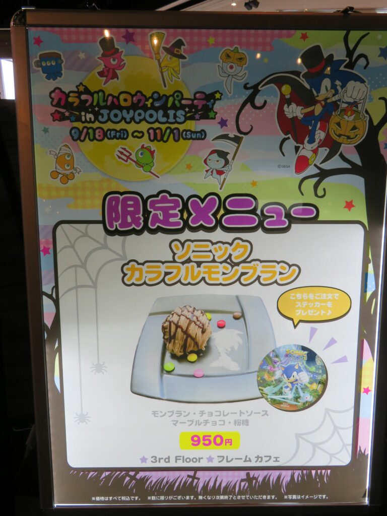 3階のフレームカフェでは、期間限定で「ソニック・カラフルモンブラン」がメニューに加わります。シュガーパウダーでソニックが描かれたスイーツを注文すれば、オリジナルのステッカーがプレゼントされます。